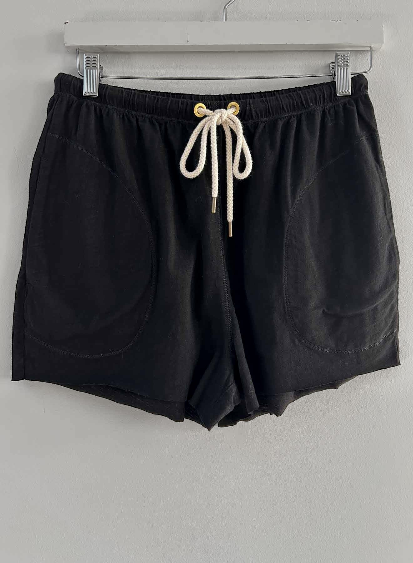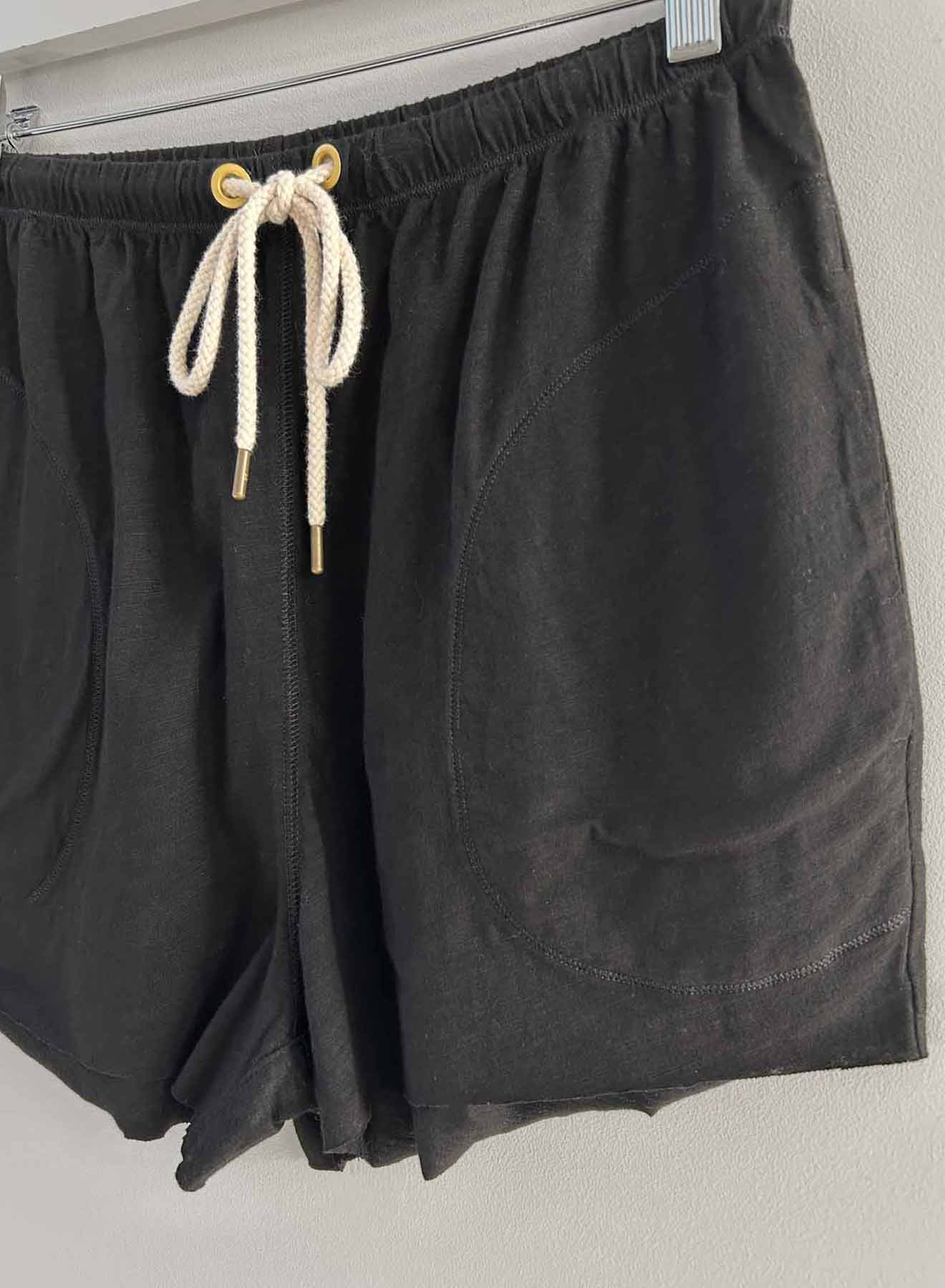 The Tommy Short is designed with life in mind, it features on-seam side pockets for when all other storage seems out of reach. Two big back patch pockets double as coverage and a place to put the smaller things when on the go. Matte gold grommets and a tightly woven drawstring tipped with metal tips. Interior elastic at the waistband, and raw cut edges at the bottom. The fit is relaxed with a high rise that allows you to wear it at the waist for a moderately slouchy look. You can also opt to wear it low riding with a dropped rise for a super slouchy fit. Made from our washed cotton slub jersey with a firm, soft hand that only gets better with every wash. Tonal cover stitching and design identity match our Ava and Rebel tees.