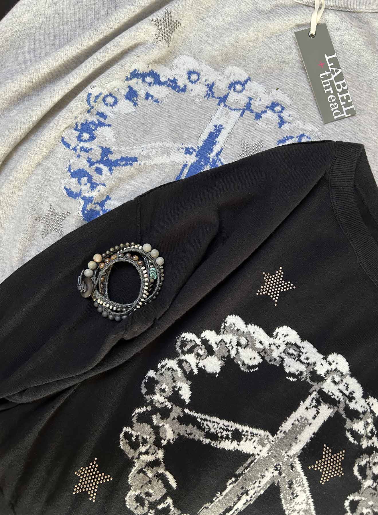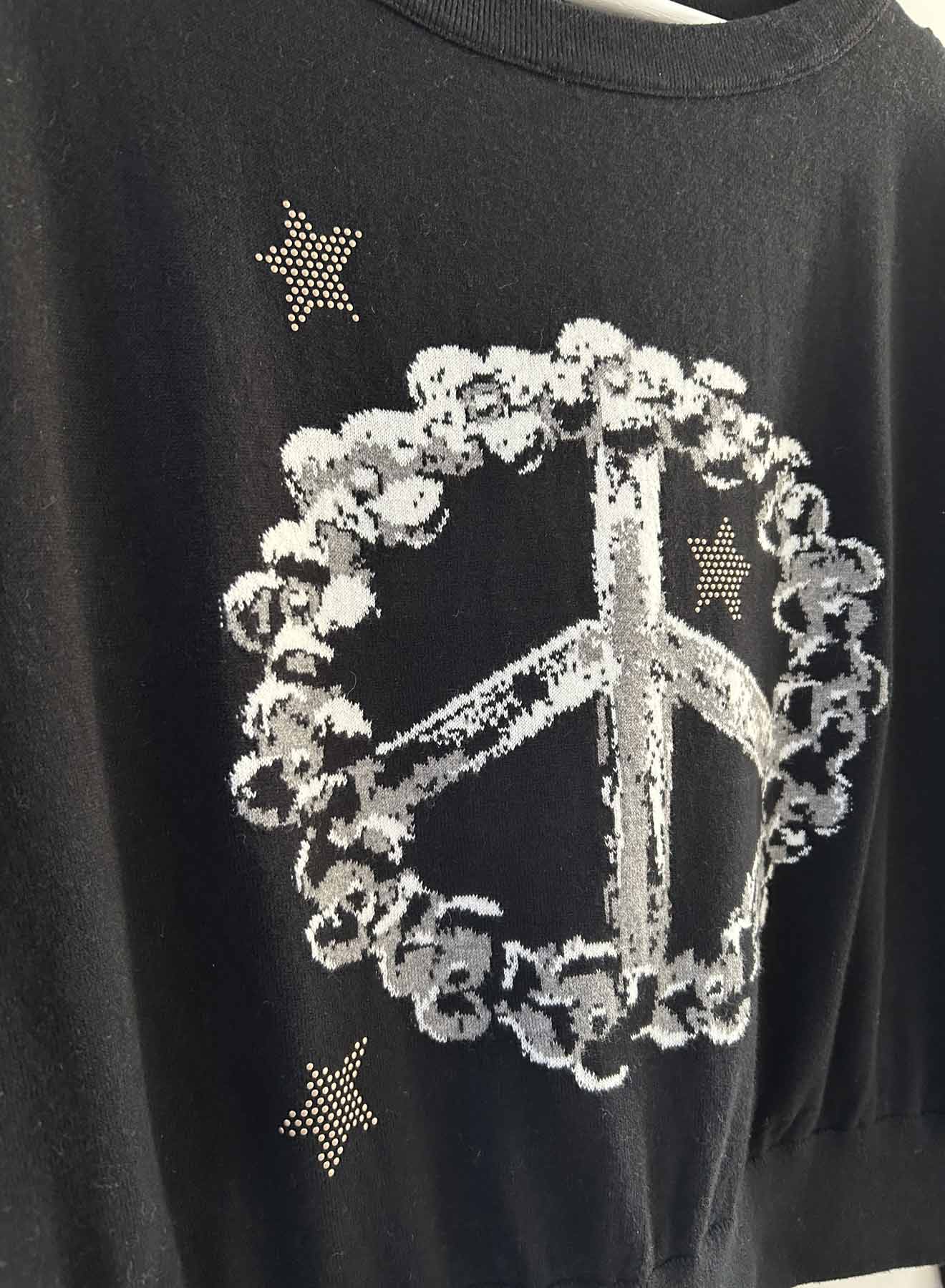 The Rose Peace Stud sweater puts a dreamy, boho spin on a classic knit. Designed with a peace-shaped flower wreath in true intarsia knitting, this standout graphic feels both playful and artisanal. Crafted from our cotton cashmere transition blend, it's soft, cozy, and made for everyday wear. The cropped, hug-fit silhouette with fitted cuffs and hem pairs perfectly with high-waisted denim or casual shorts, while star studs add a whimsical finishing touch.