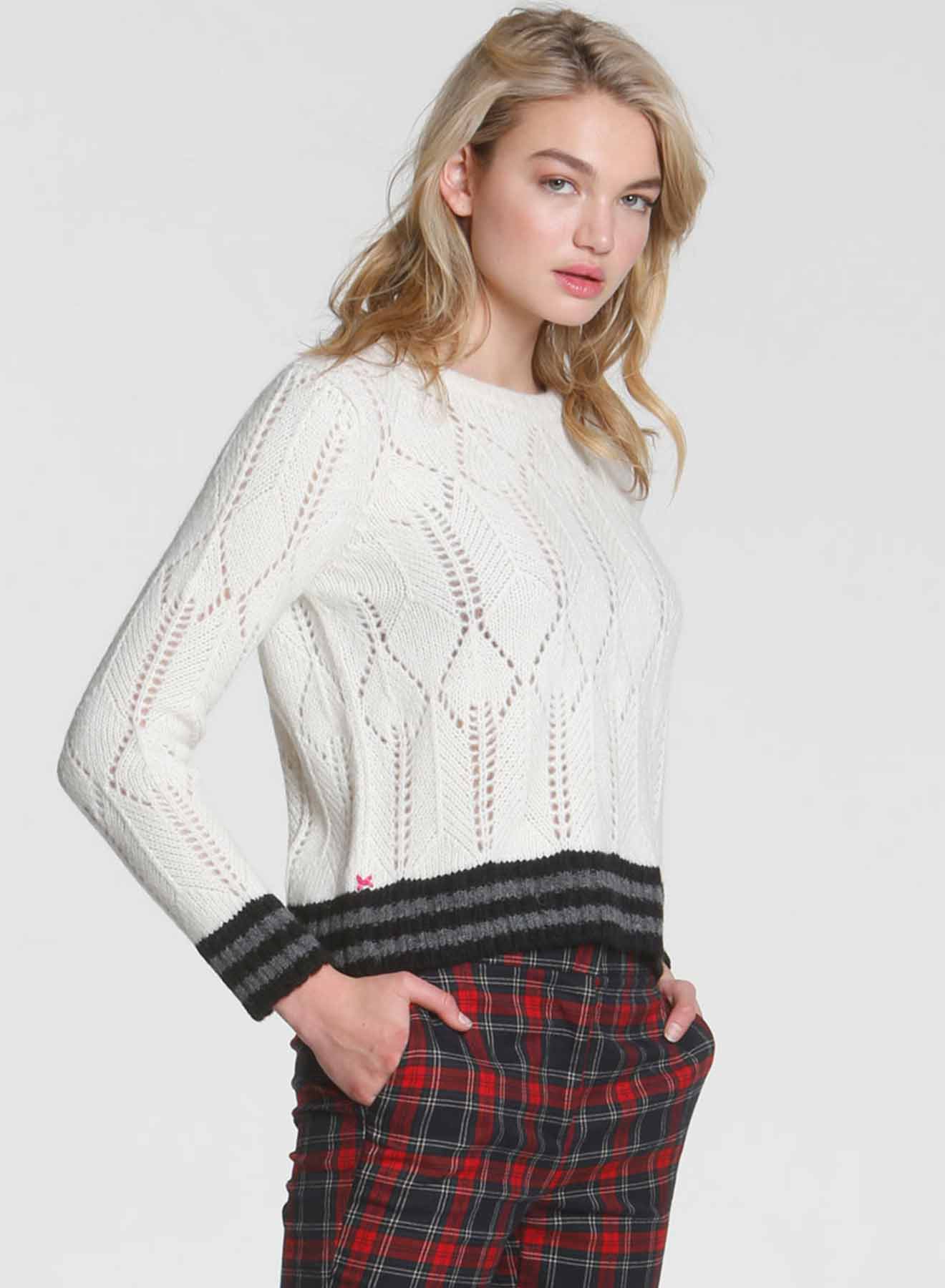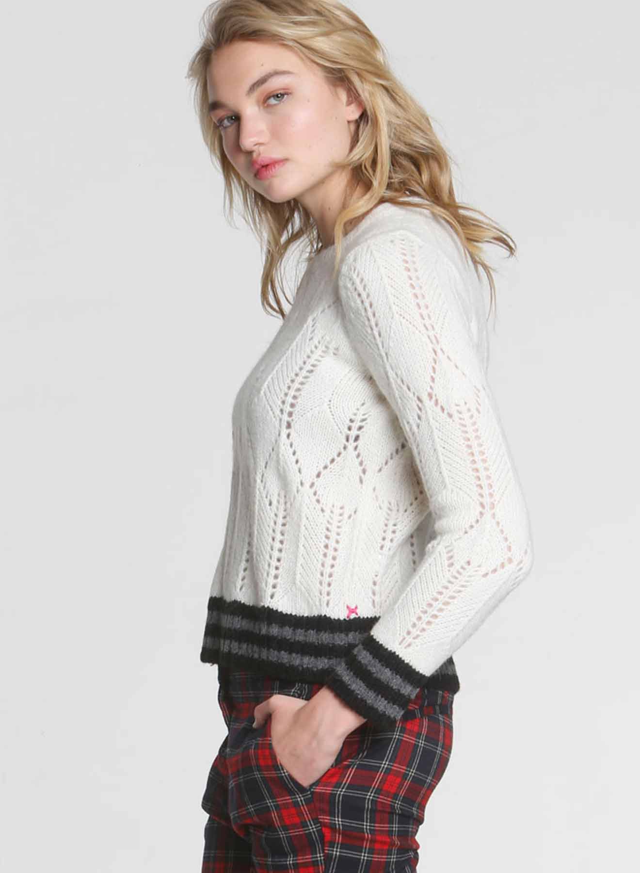 The Girlfriend Ski Sweater is the perfect mix between feminine and sporty. Even if you are not typically drawn to pointelle textures, the varsity striped cuffs put a contrasting twist on this winter crew. Made from our lofty novelty alpaca blend, it will keep you warm and cozy as we get closer to cold winter weekends. We are in love with the soft Heather Rose color, but it's hard to refuse a fresh Winter White. We will leave the color dilemma to you. Signature pop-color X-stitches at the side seams. Looks great with denim or dressed up for office or date night. Make it yours!