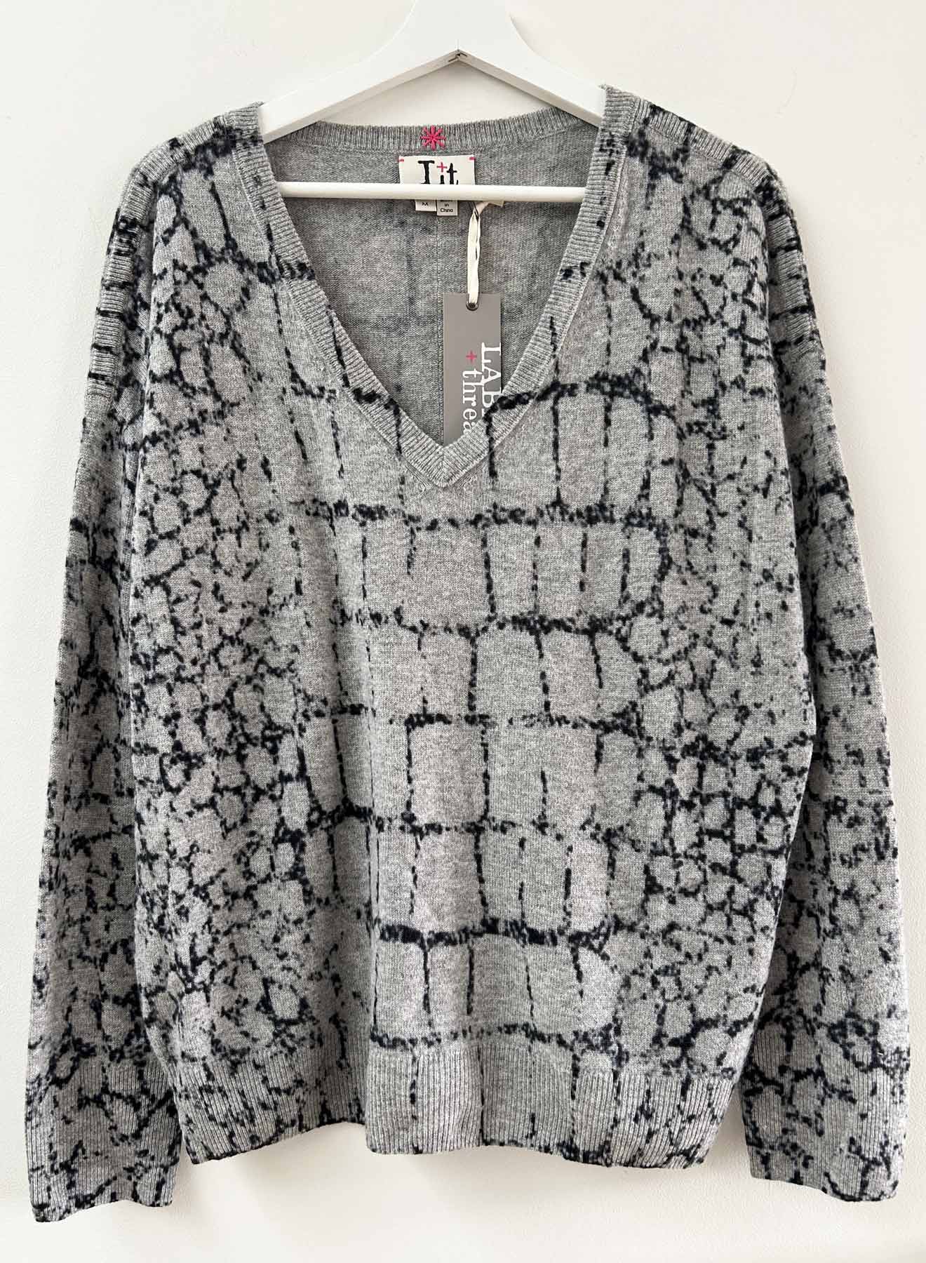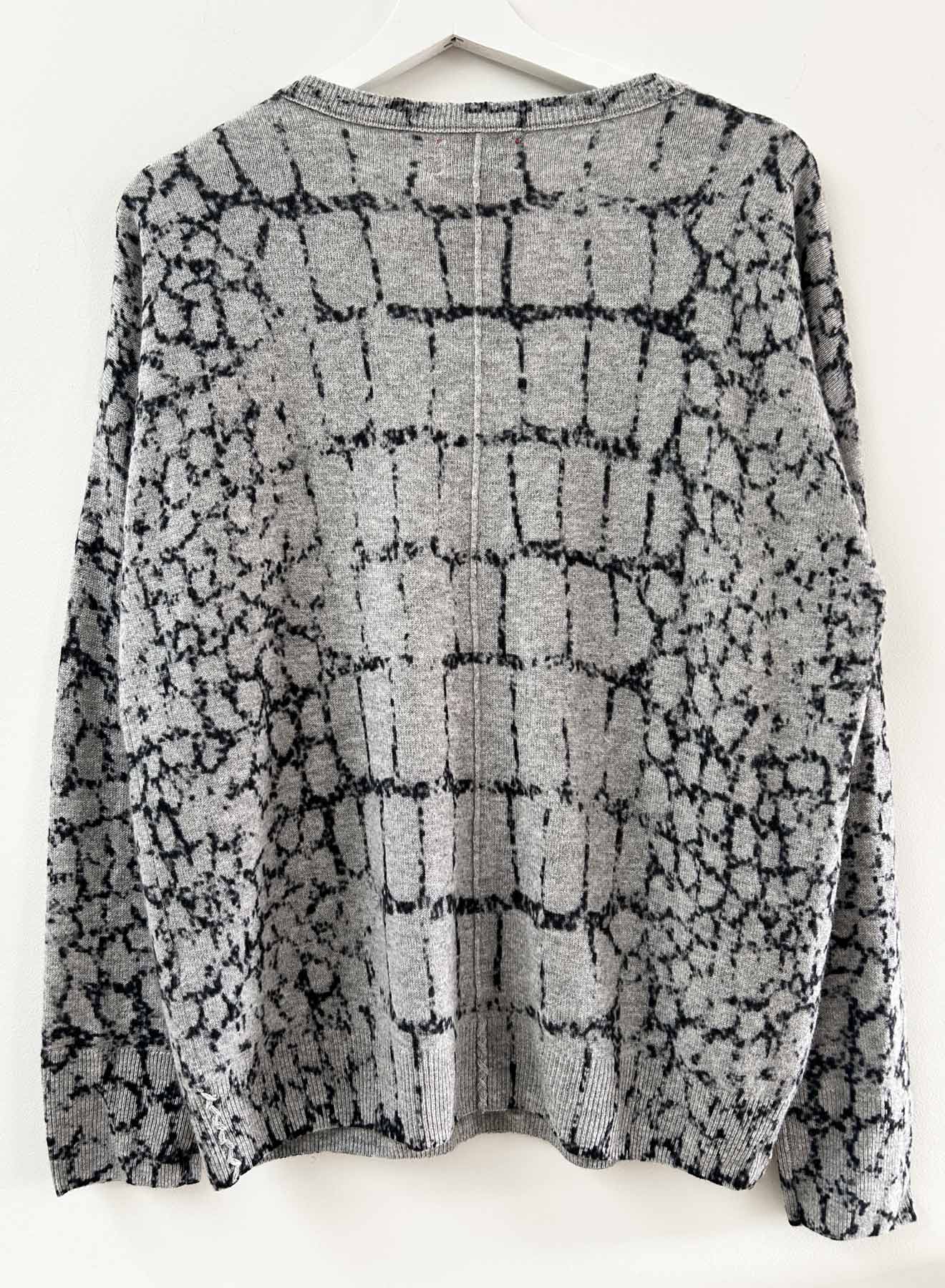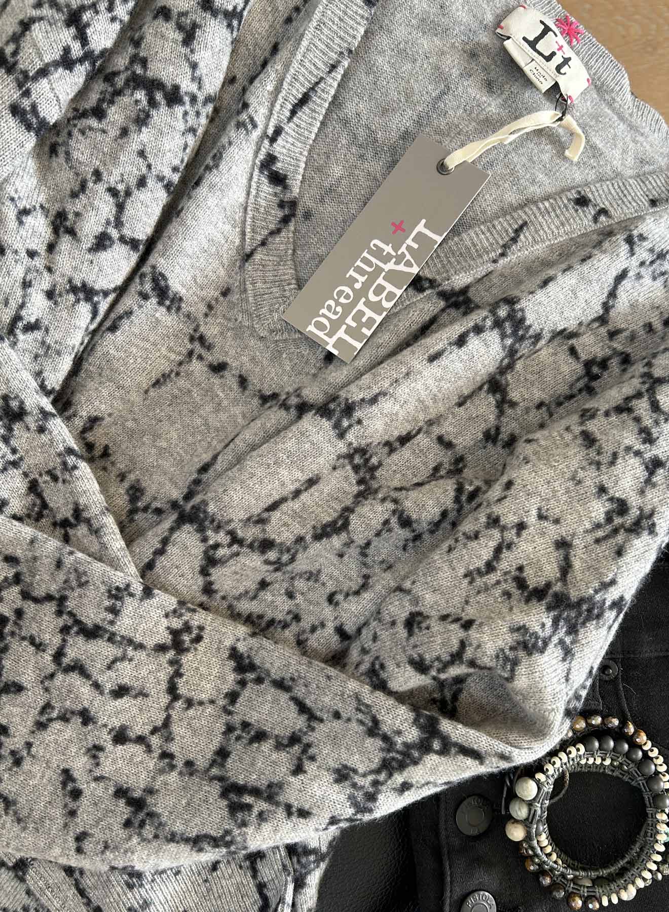 Tired of camo and Big Cat prints yet? Try this ultra chic all over Croc pattern to change it up a bit. Stylized and distressed to a point of near abstraction. Skip the Croc Clutch and wear it instead! Made from 100% cashmere in our CORE Collection Boyfriend Vee silhouette. With its relaxed roomy fit, drop shoulder, high ribs and flattering v-neck, this style is a versatile novelty option any day of the week.