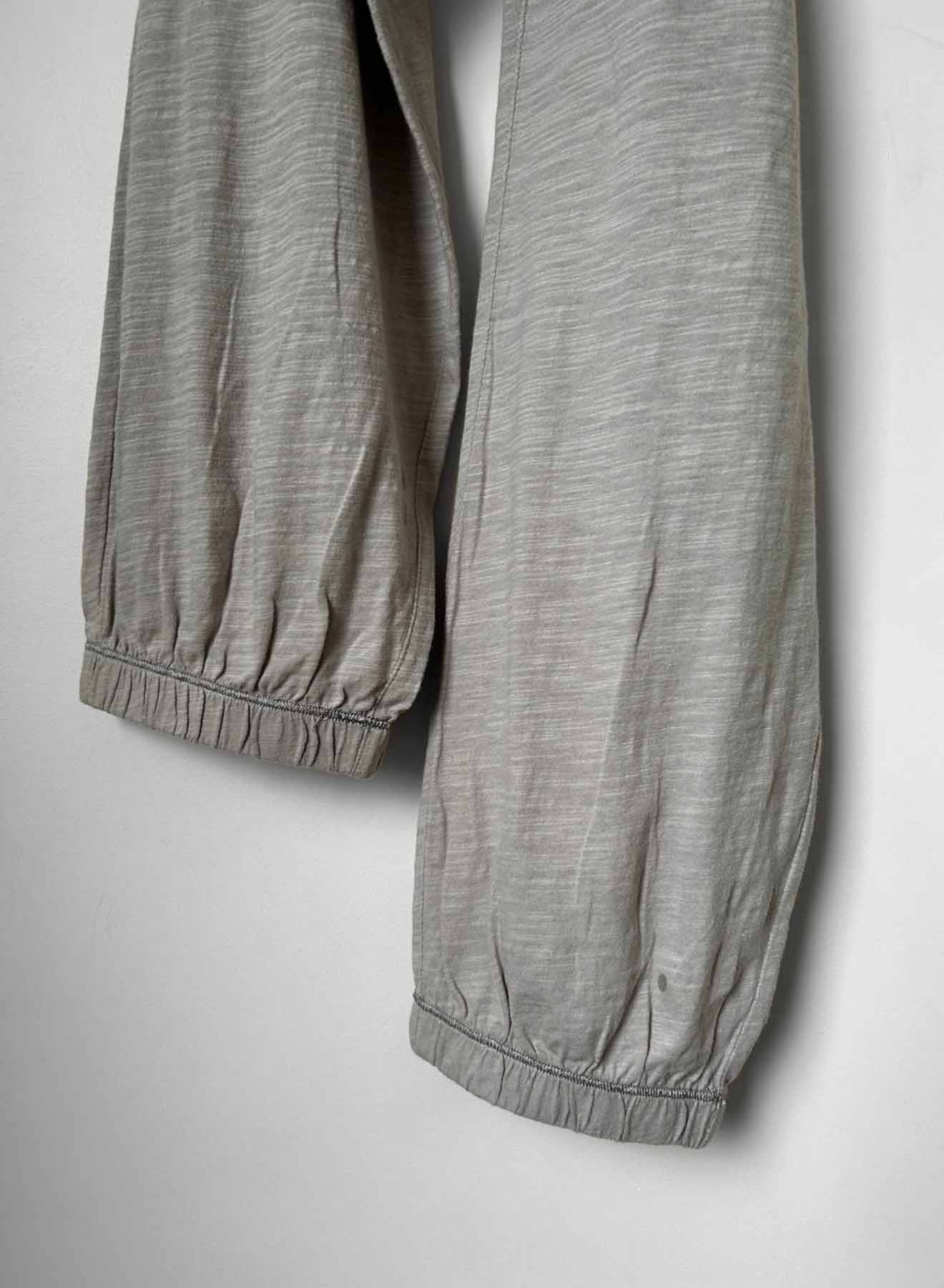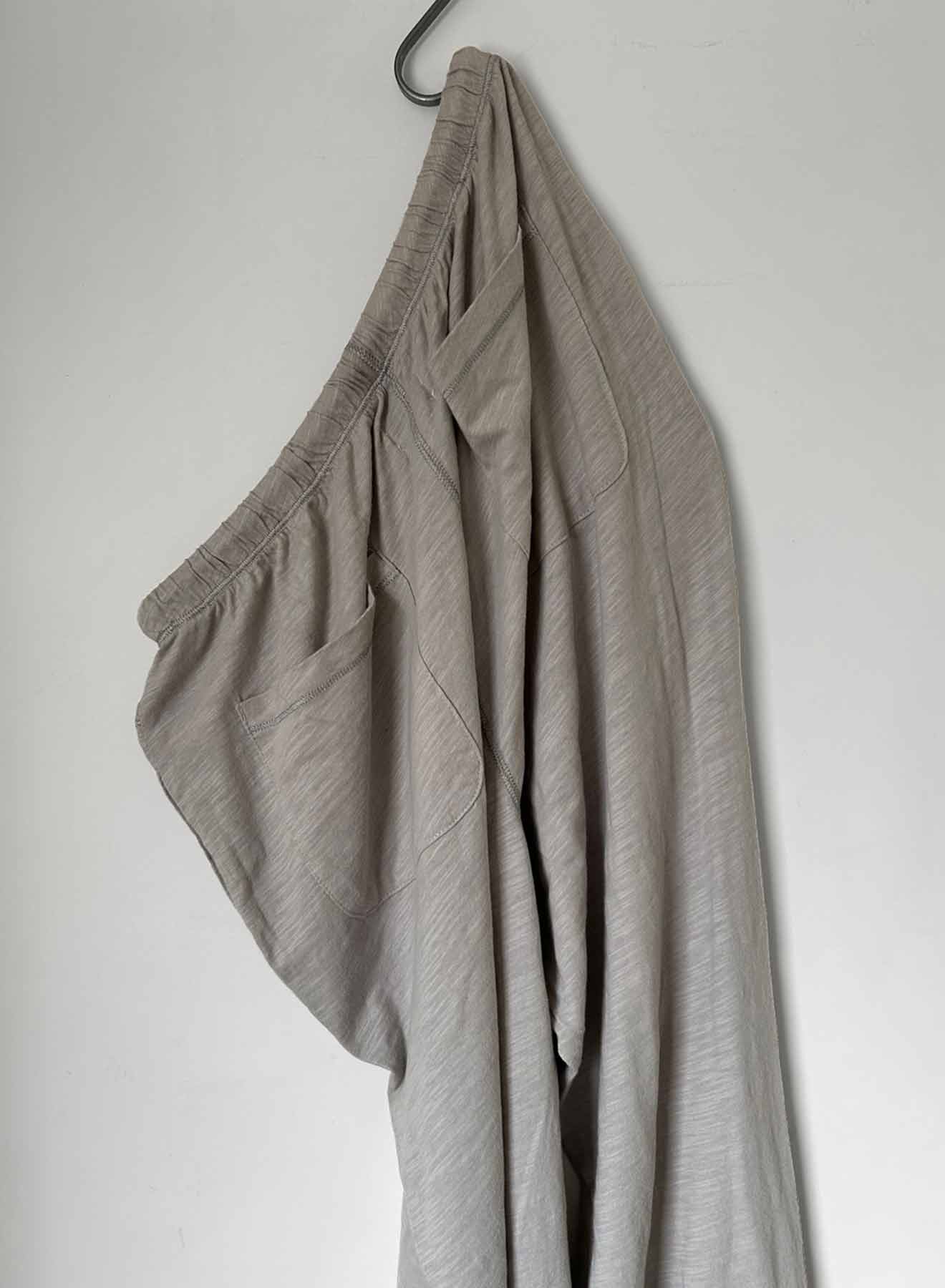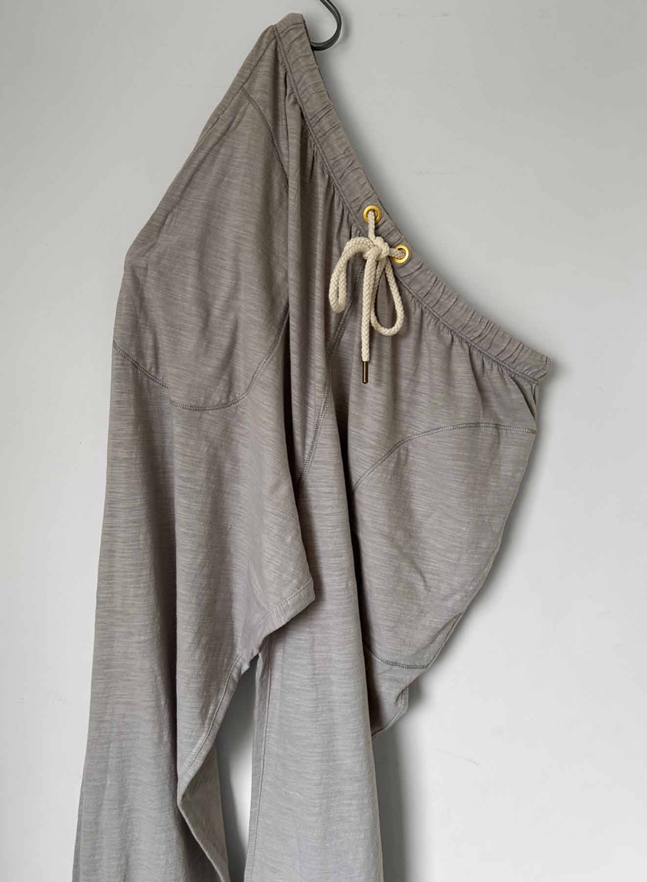 The great thing about the Jerri Lounge Pant is that you can do so much more than just lounge in it! Designed with life in mind, it features on-seam side pockets for when all other storage seems out of reach. Two big back patch pockets double as coverage and a place to put the smaller things when on the go. Matte gold grommets and a tightly woven drawstring tipped with metal tips. The waistband features interior elastic, a detail essential to a securely fitting pull-on pant. The fit is relaxed with a high rise that allows you to wear it at the waist for a moderately slouchy look. You can also opt to wear it low riding with a dropped rise for a super slouchy fit The saddle is reinforced with a shaped and seamed gusset. Made from our washed cotton slub jersey with a firm, soft hand that only gets better with every wash. Tonal cover stitching and design identity match our Ava and Rebel tees.