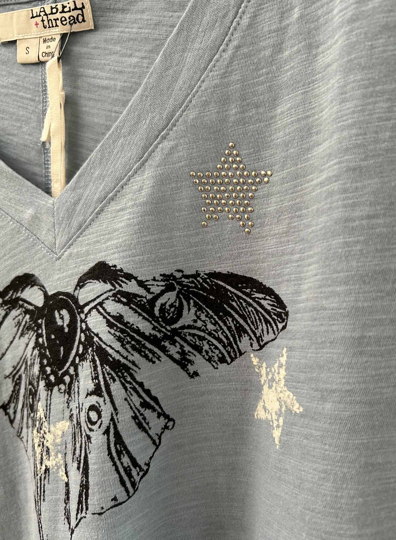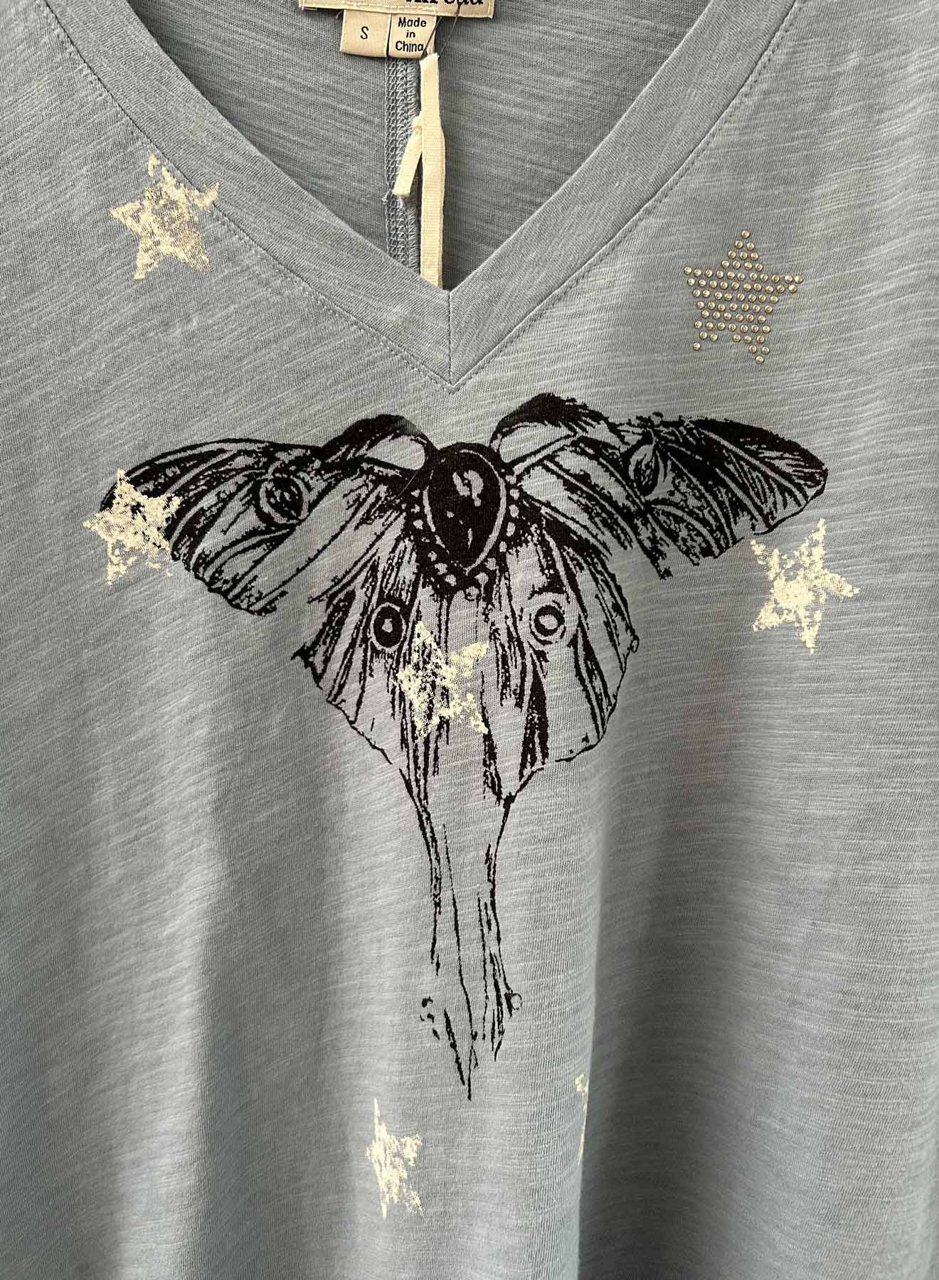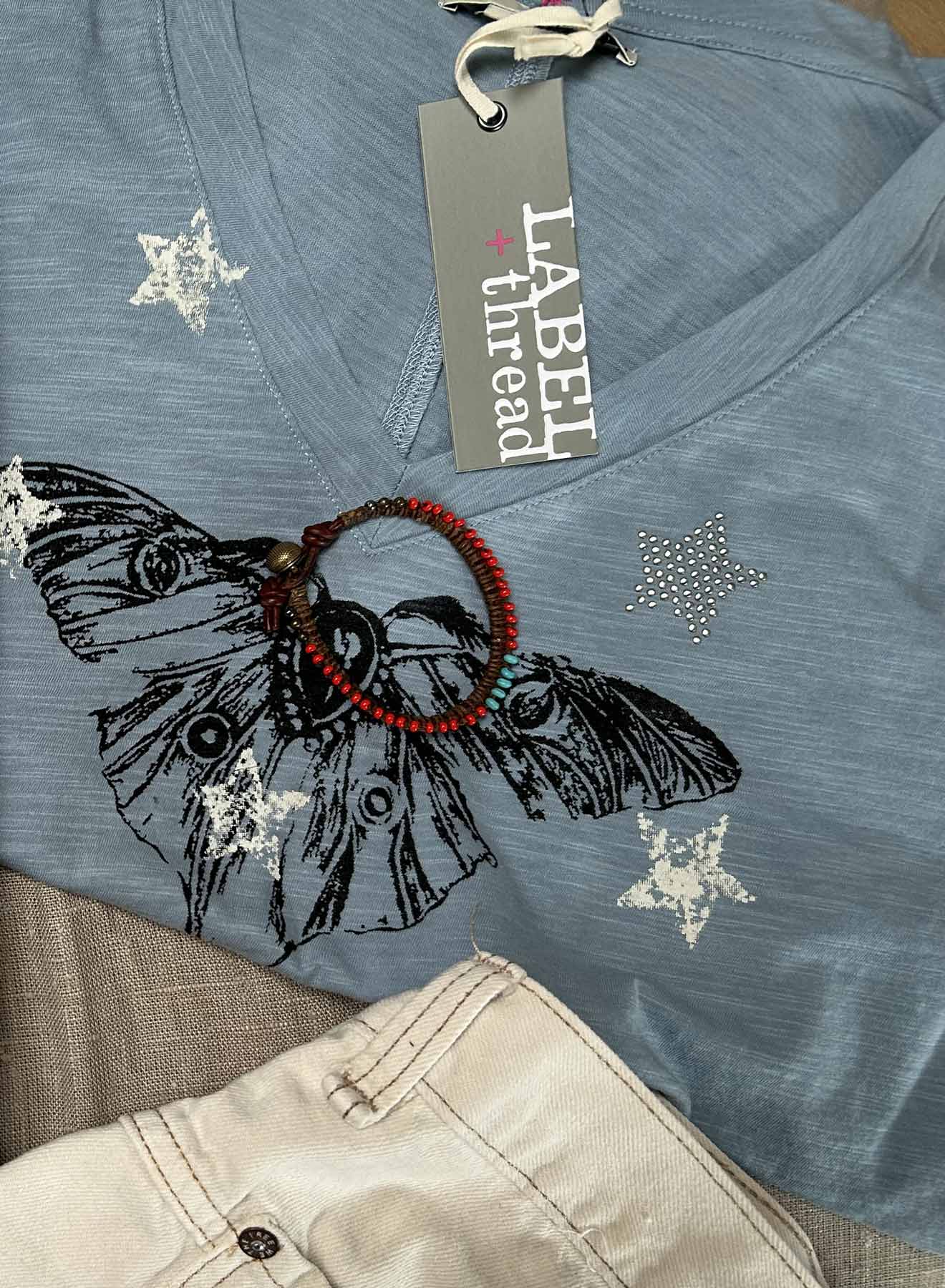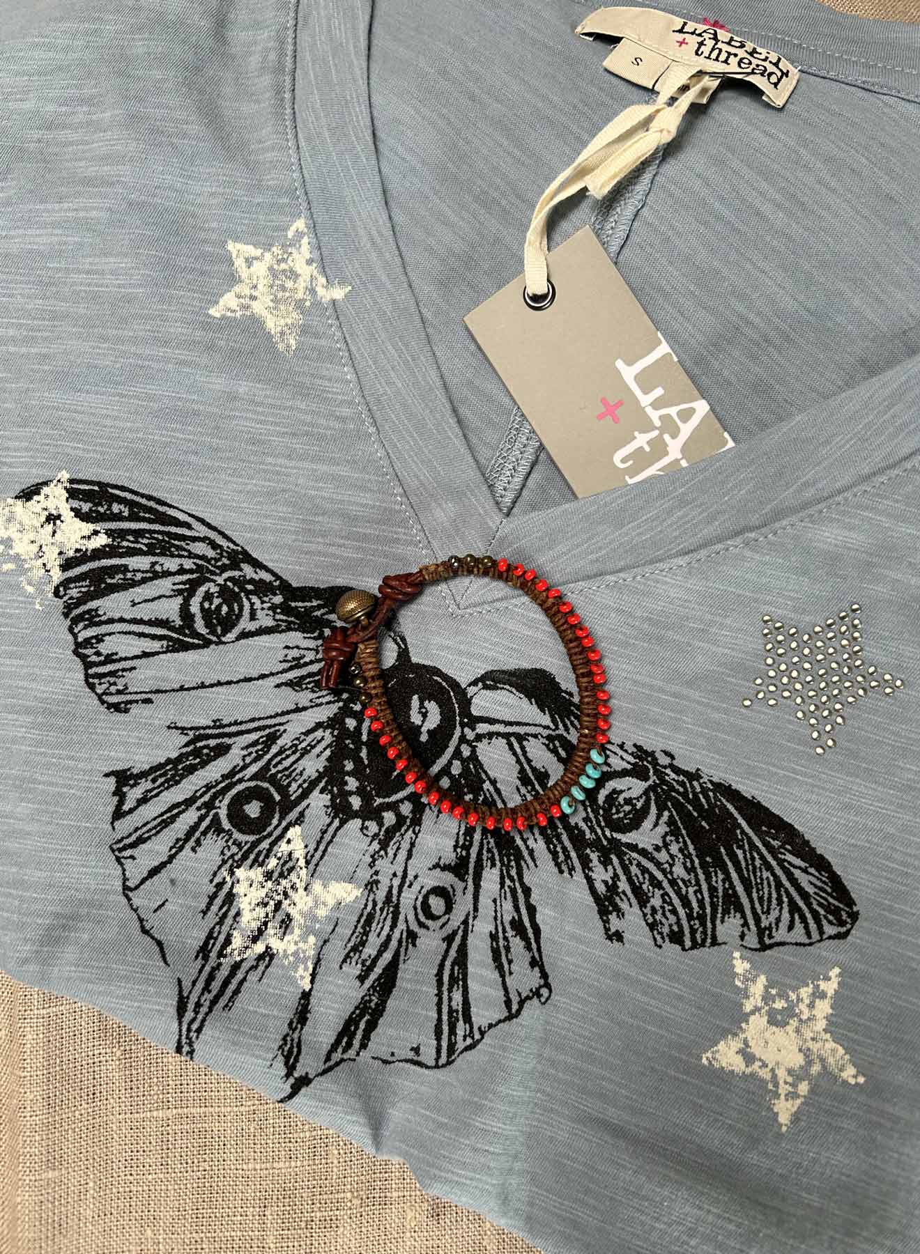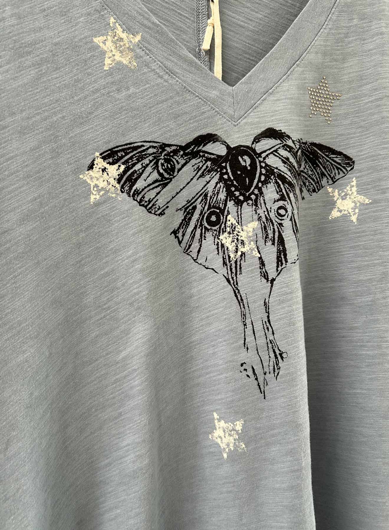 Our Graphic Tees & Tanks are designed and locally printed in small batches making each design a limited edition. Every screen is artfully distressed and lovingly layered to create a unique tee with original artwork. Faded metallics combine with scattered charms and vintage inspired motifs, inspired by our most current thoughts. Printed with eco-friendly dye stuff in the USA.