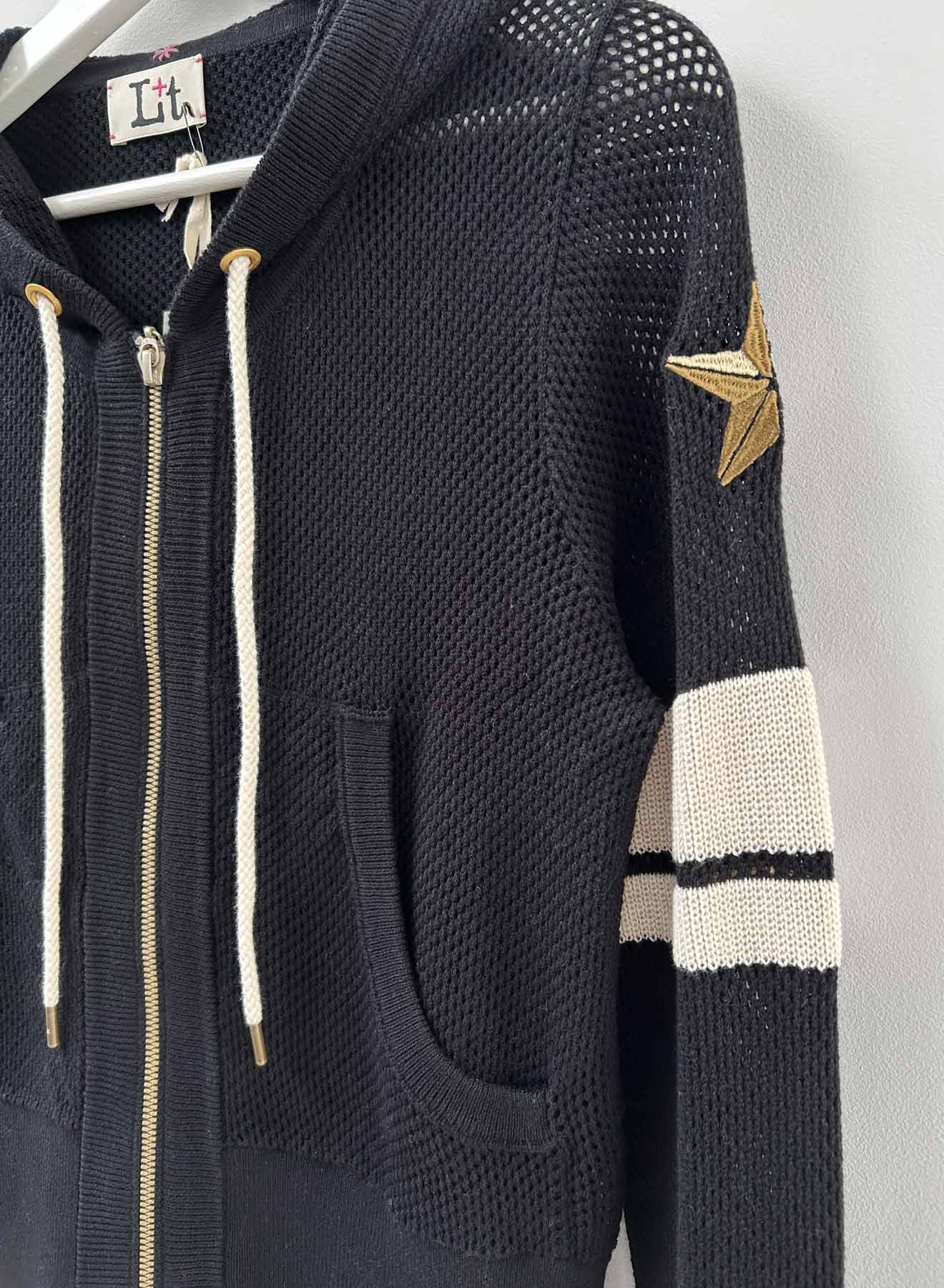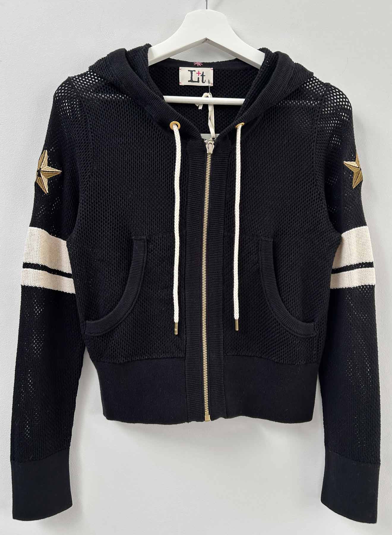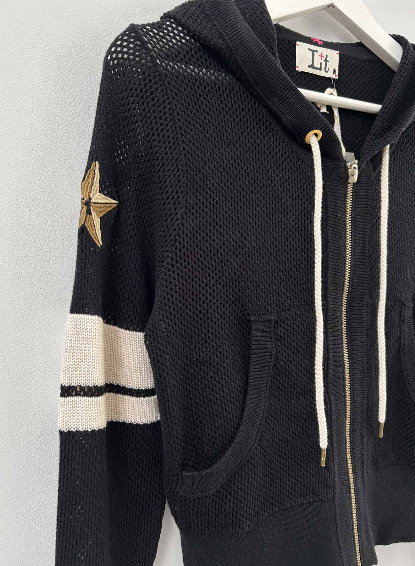 The Lucky Mesh Hoodie redefines casual luxury with elevated design. Crafted from 100% cotton in a mesh stitch, this piece delivers breathable ease with a sophisticated edge. Varsity stripes are at the sleeve with our signature star embroidery. Metallic details go back to the rest of the LIFEstyle+ Collection. Designed for effortless layering, it moves seamlessly from studio sessions to off-duty styling. A modern essential that blends performance, polish, and everyday cool.