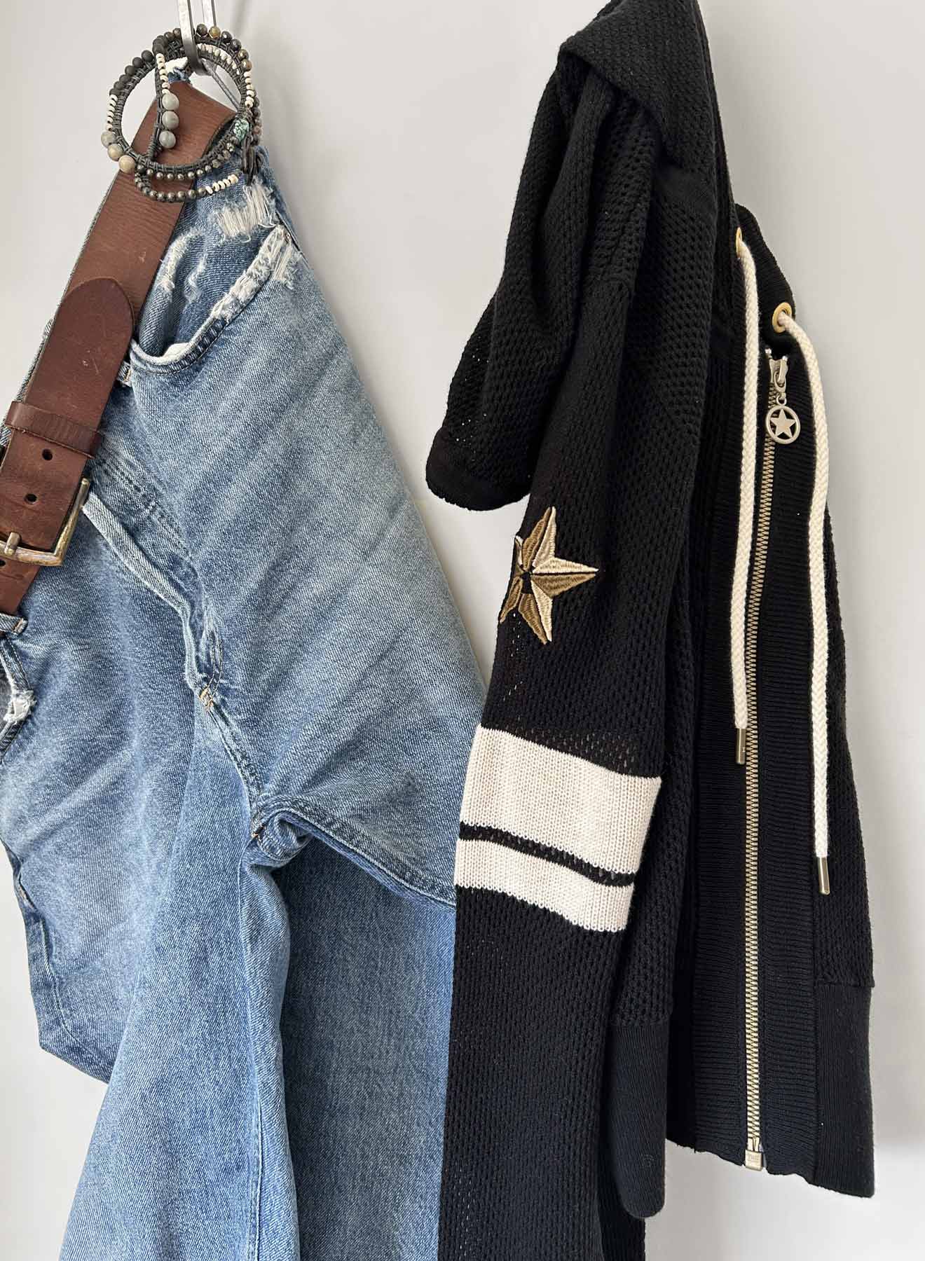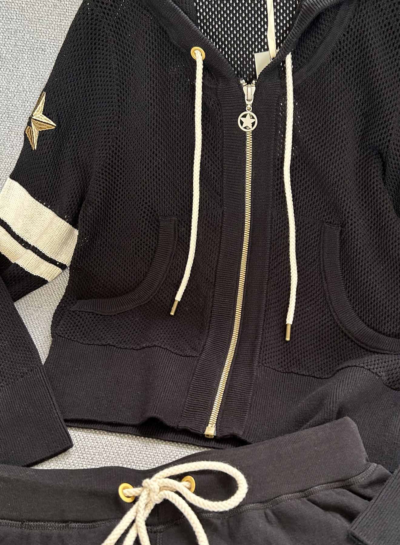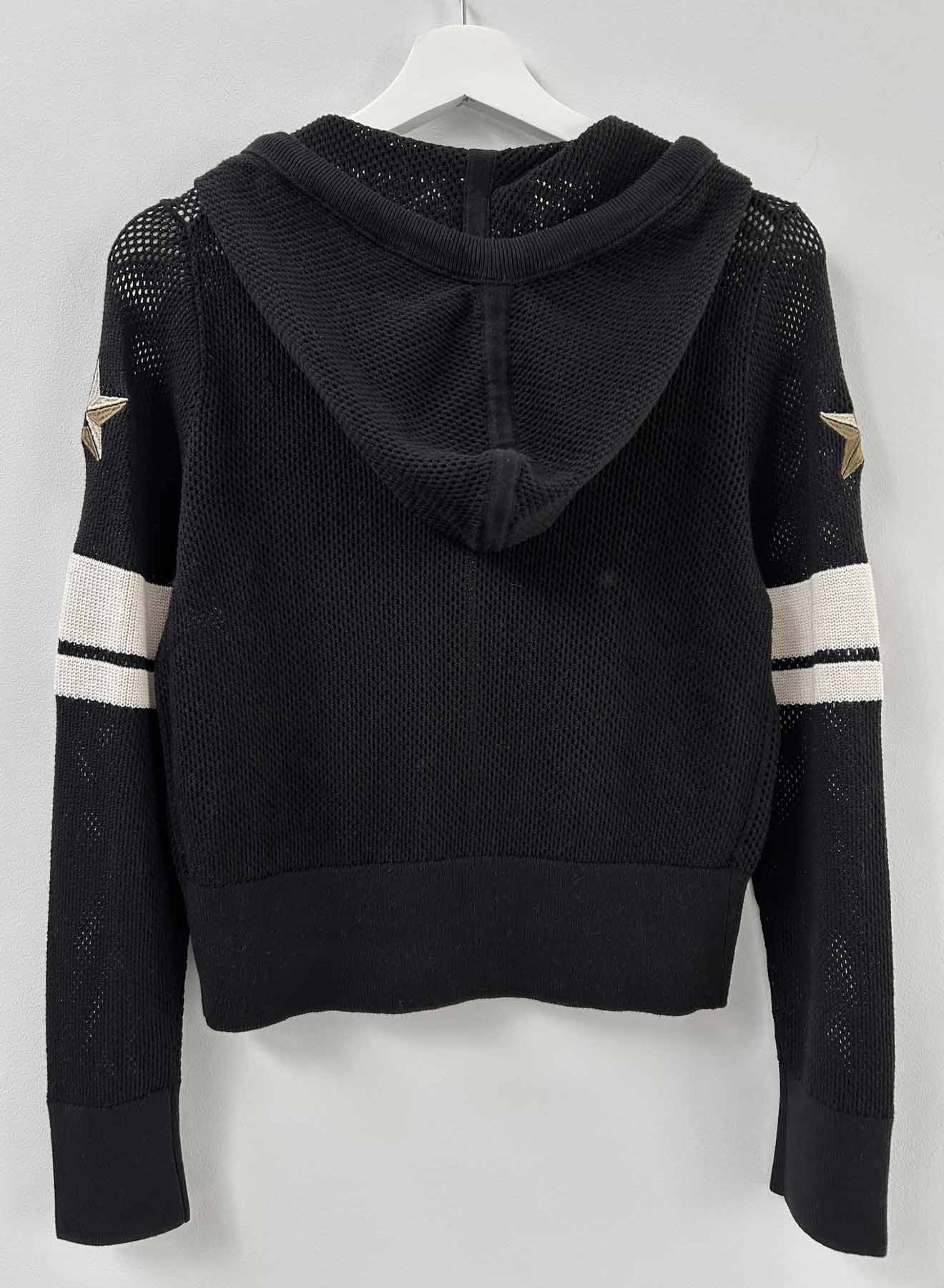 The Lucky Mesh Hoodie redefines casual luxury with elevated design. Crafted from 100% cotton in a mesh stitch, this piece delivers breathable ease with a sophisticated edge. Varsity stripes are at the sleeve with our signature star embroidery. Metallic details go back to the rest of the LIFEstyle+ Collection. Designed for effortless layering, it moves seamlessly from studio sessions to off-duty styling. A modern essential that blends performance, polish, and everyday cool.
