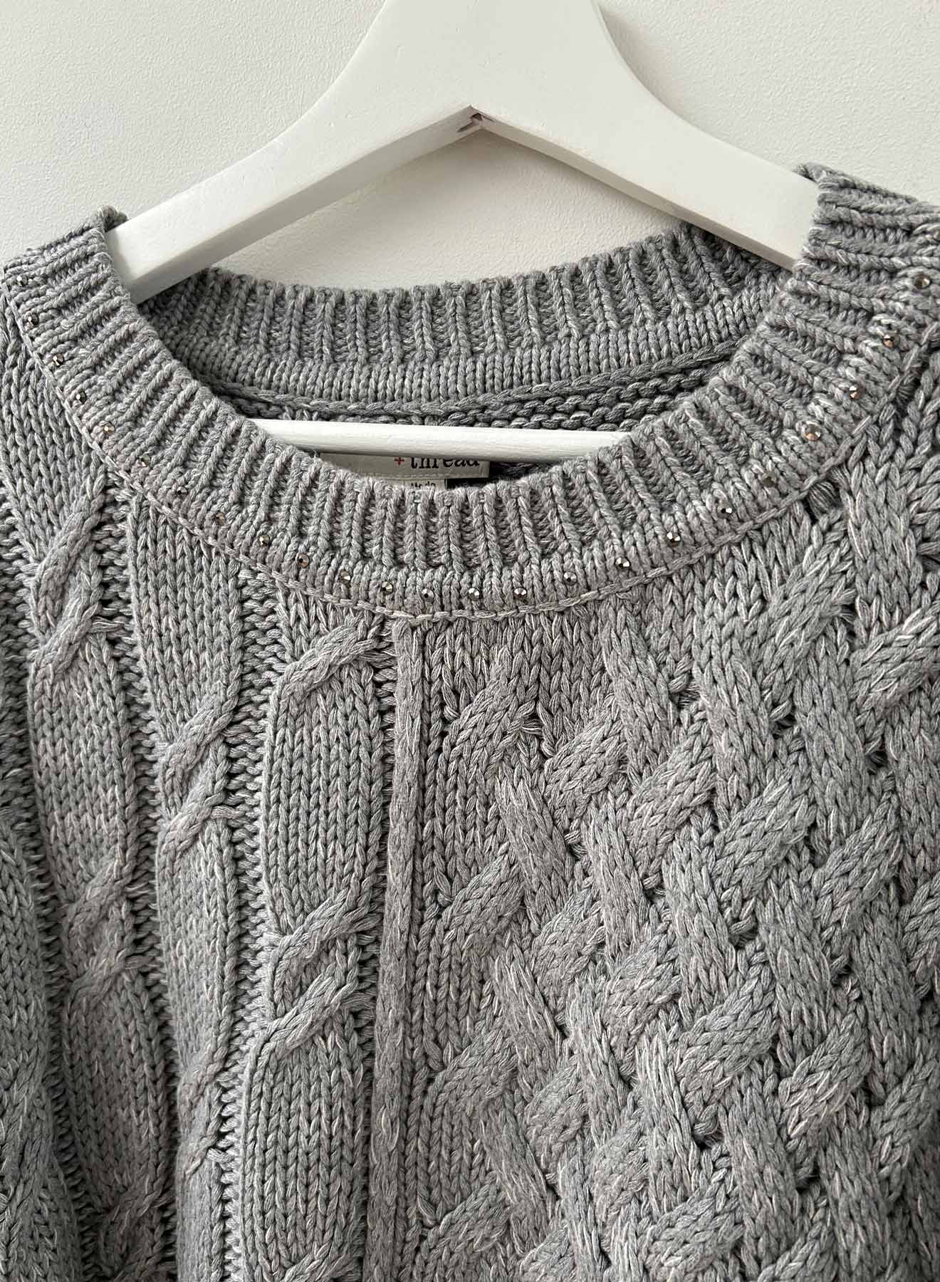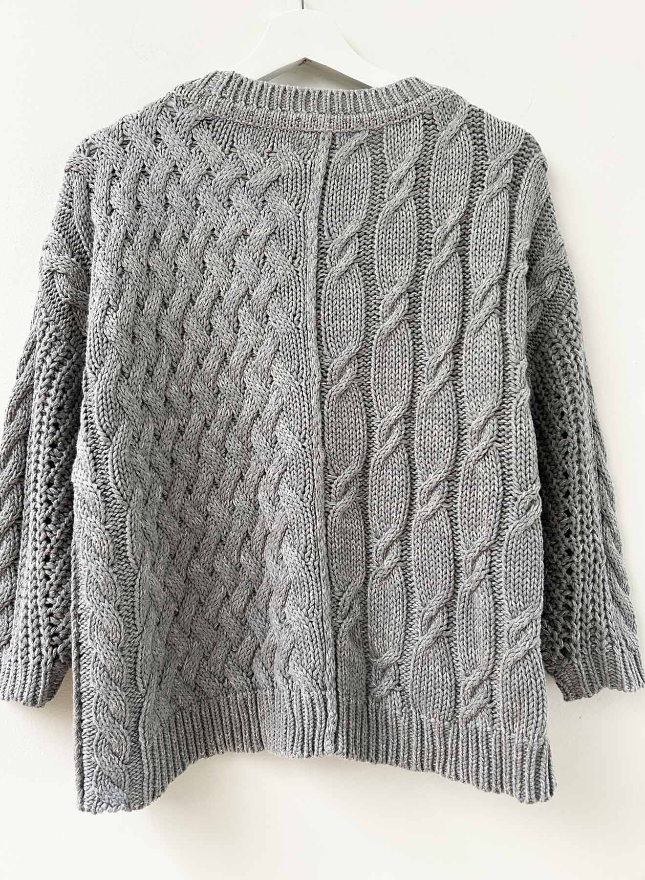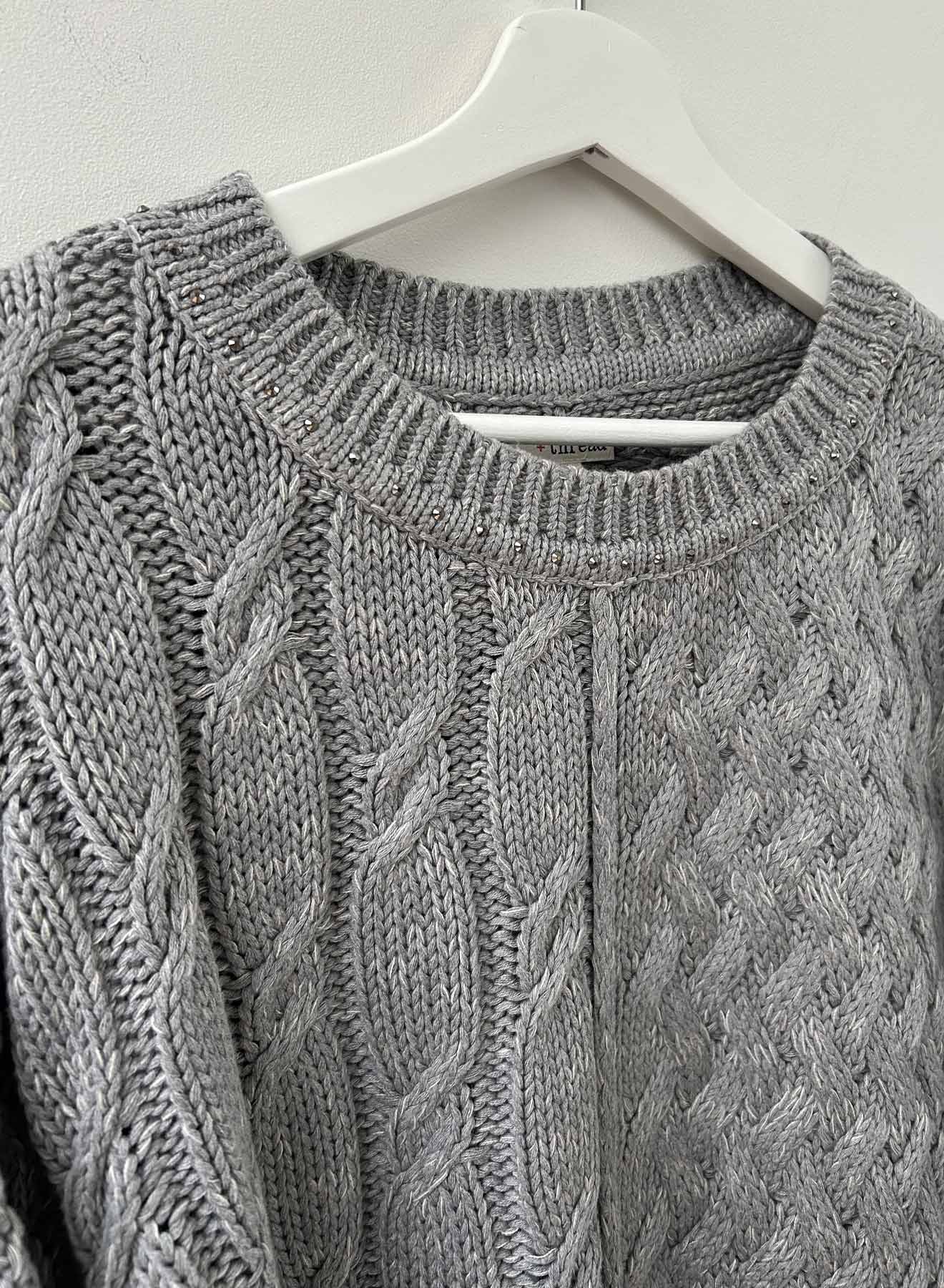 Dinner and date ready in the Shiloh Cable sweater with metallic crystals around the neck. Chunky and loosely knit, with an airy and lofty spirit, the Shiloh is a 100% cotton option for your next event asking for a polished and effortless vibe. A mixed medley of cables and engineered ribbed sleeves. Gunmetal sparkling crystals line the neck, giving your jewels the night off!