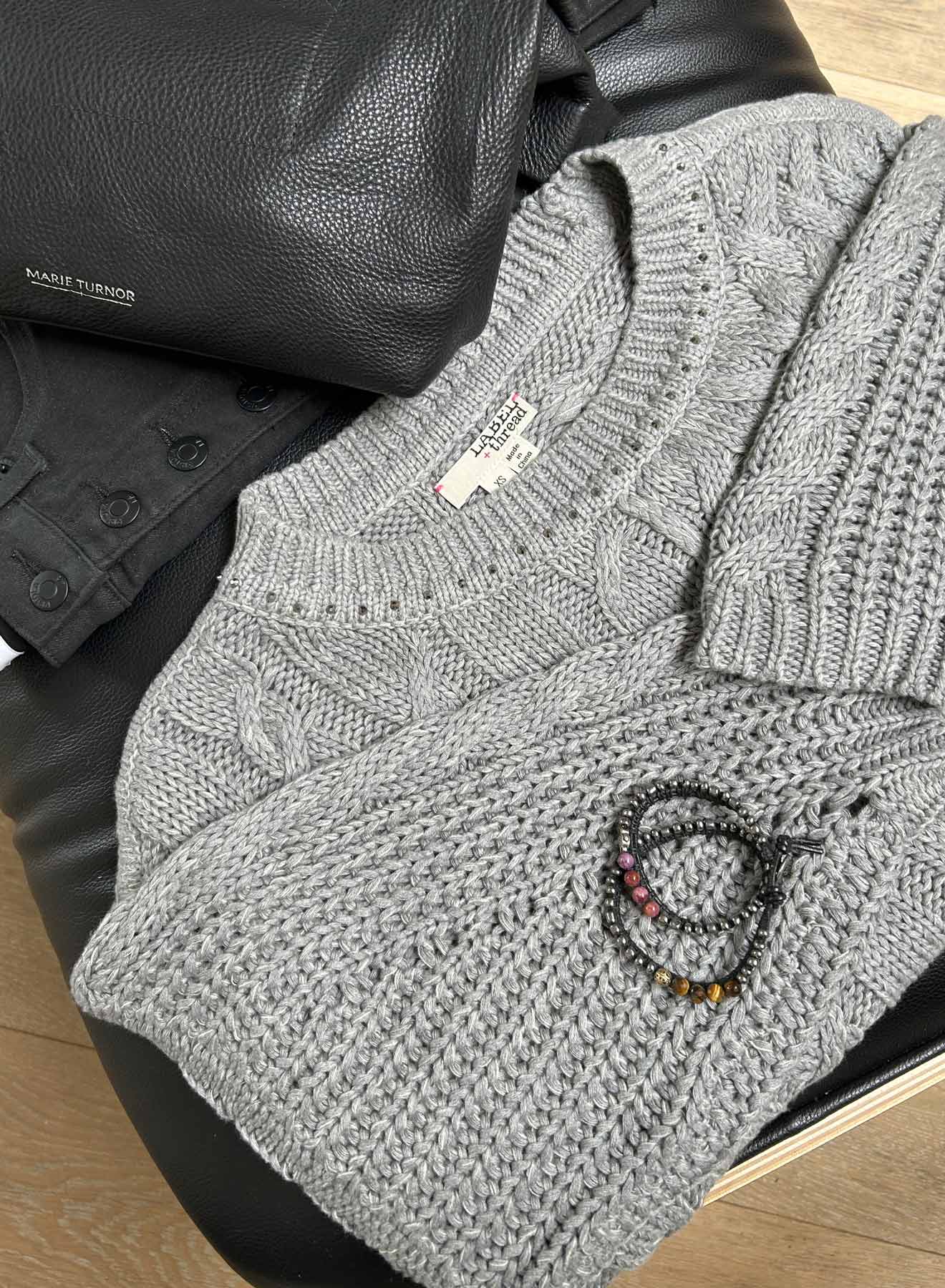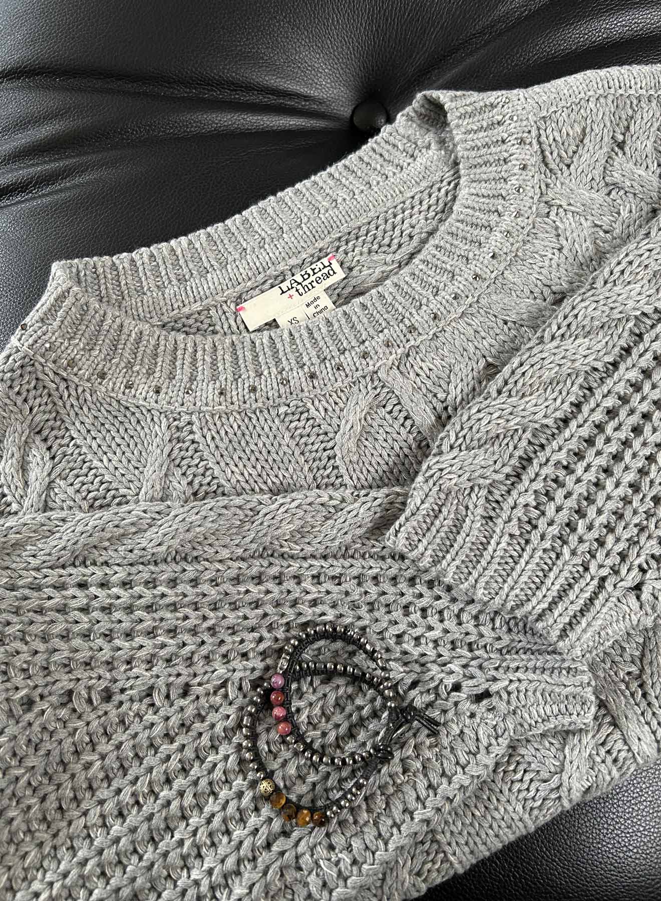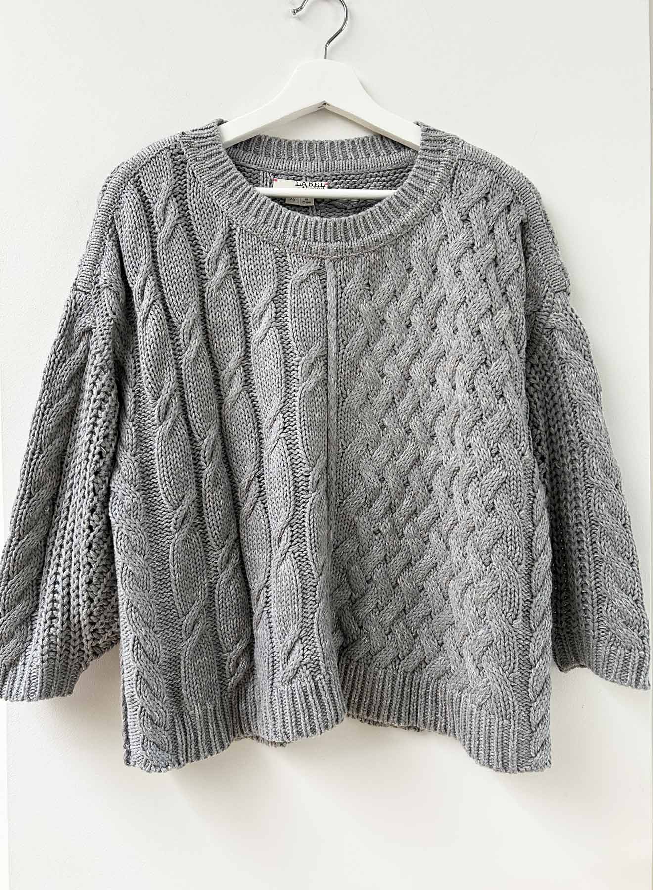 Dinner and date ready in the Shiloh Cable sweater with metallic crystals around the neck. Chunky and loosely knit, with an airy and lofty spirit, the Shiloh is a 100% cotton option for your next event asking for a polished and effortless vibe. A mixed medley of cables and engineered ribbed sleeves. Gunmetal sparkling crystals line the neck, giving your jewels the night off!