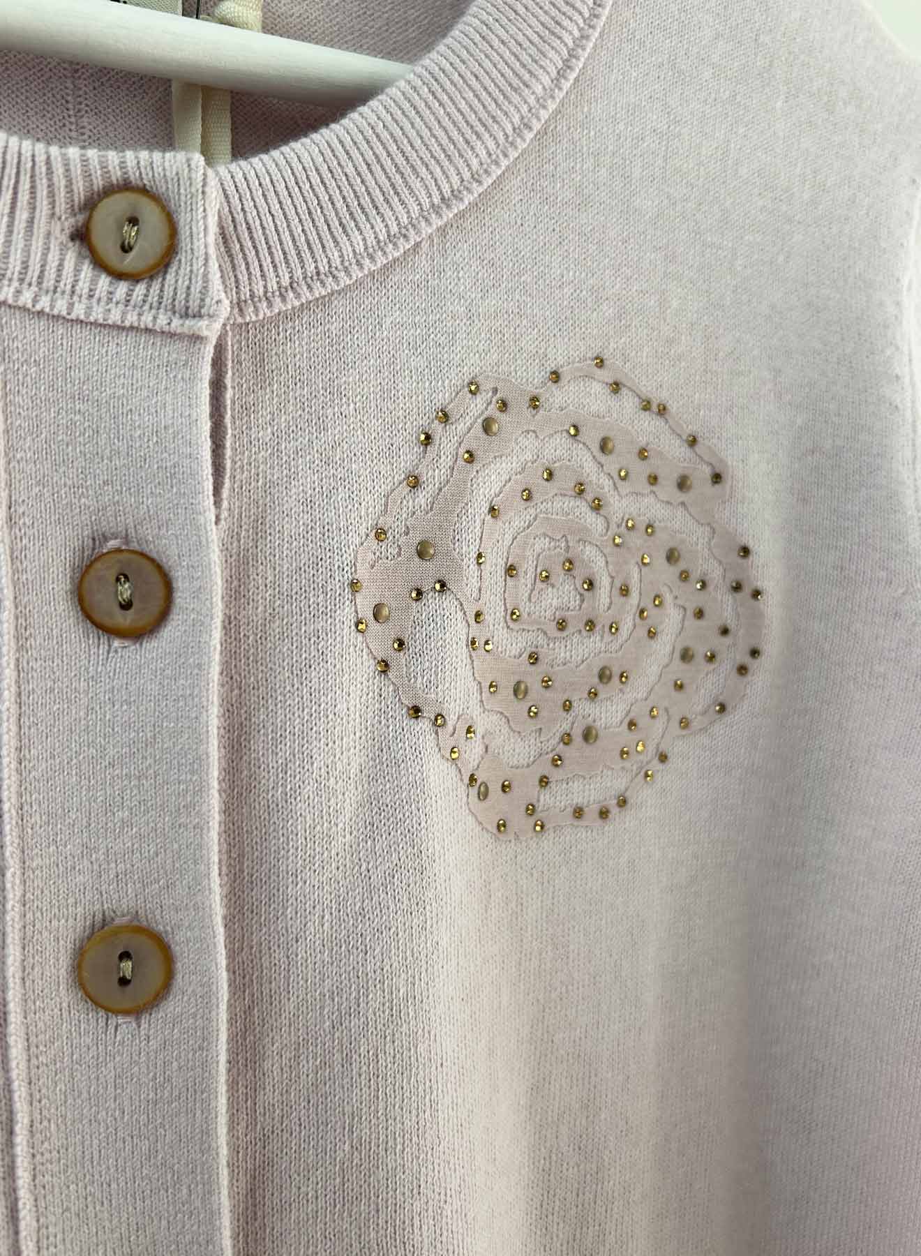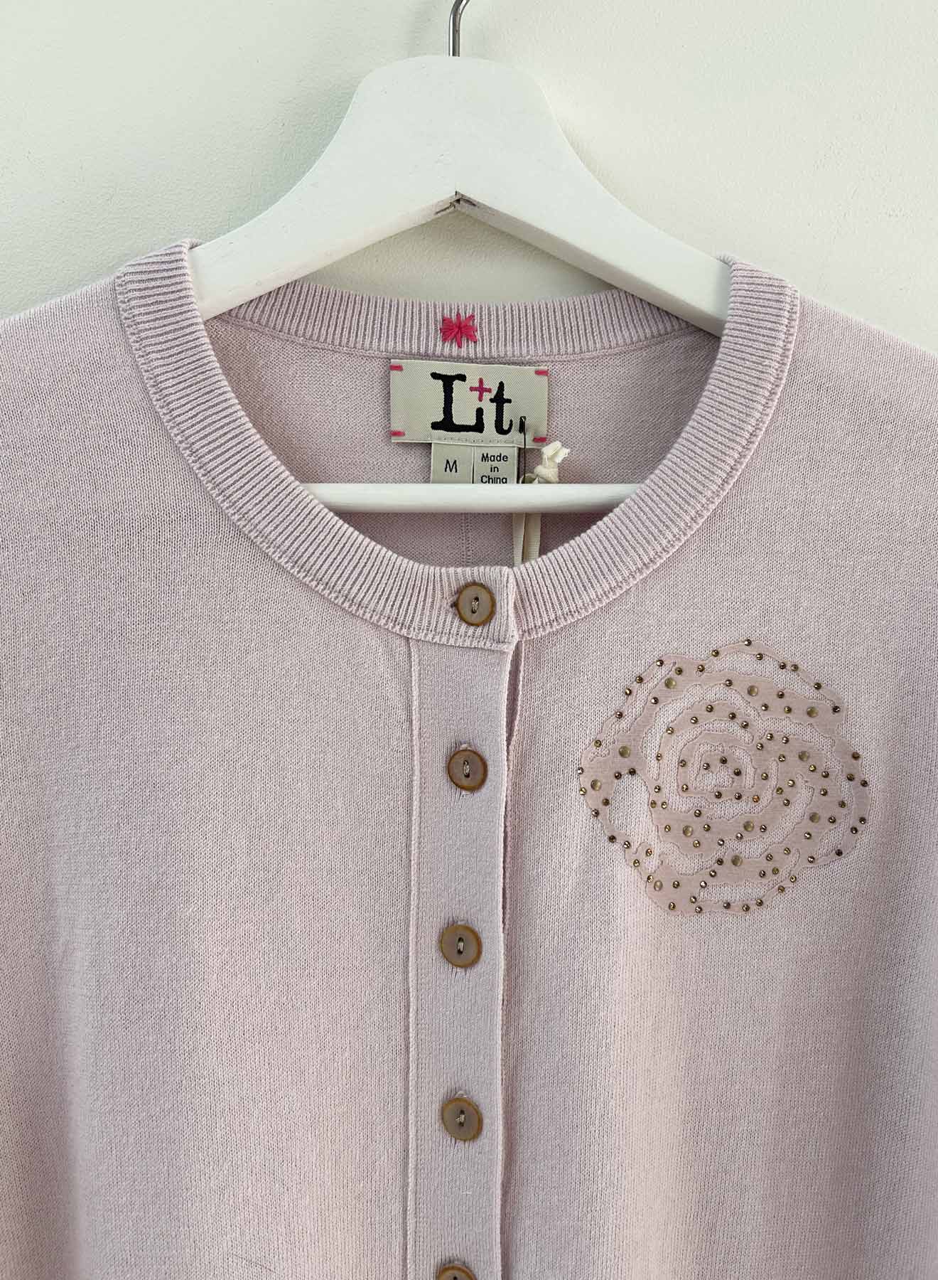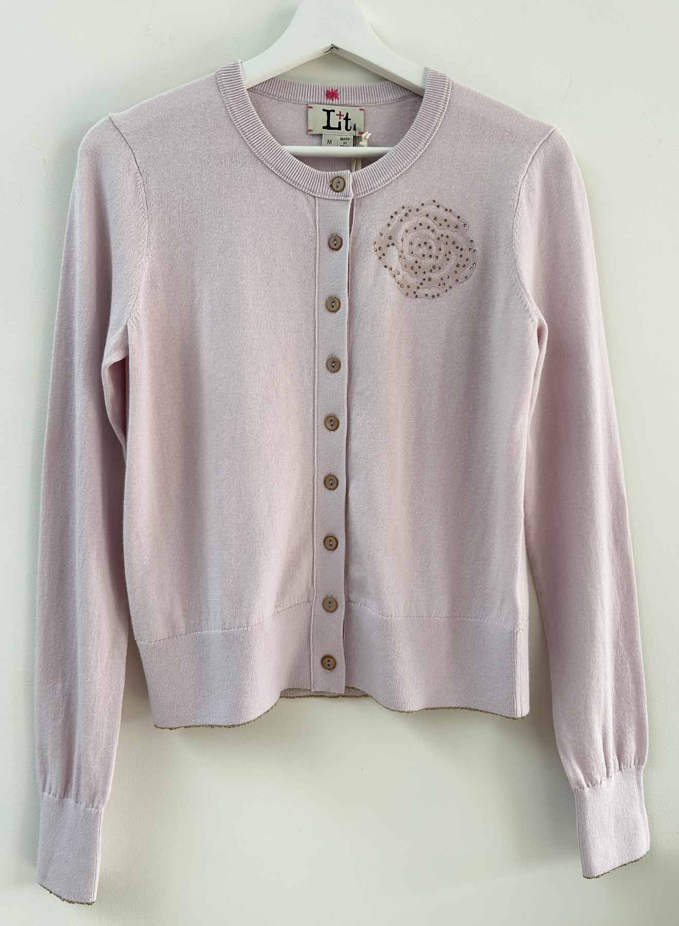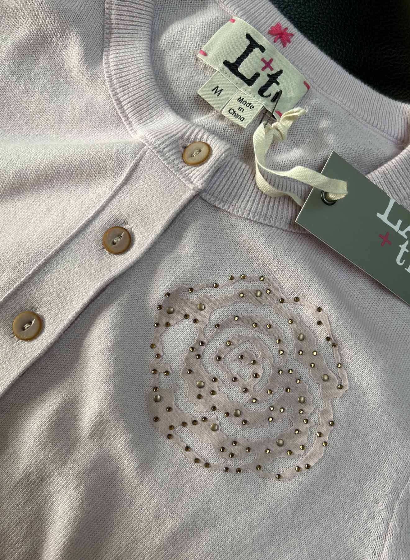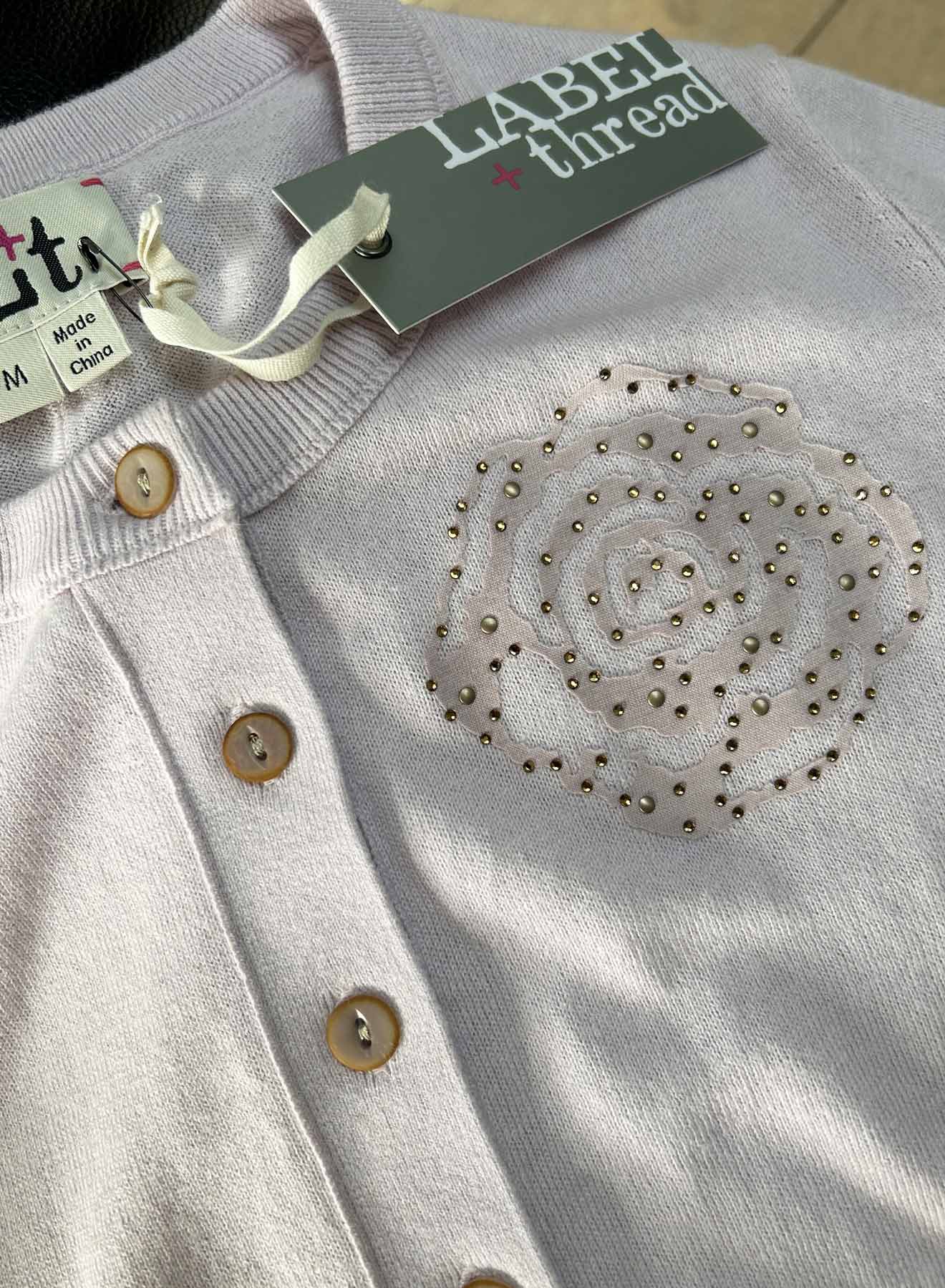 The Texas Rose Cardigan is the perfect party topper over skinny strap camis or over a simple white tee. Knit from our cotton cashmere blend. Slim, classic fit. Corozo nut buttons. Gold lurex tipping and a cut rose applique with mixed metal crystals on the chest. Leave the jewels at home and let the Texas Rose do the talking!