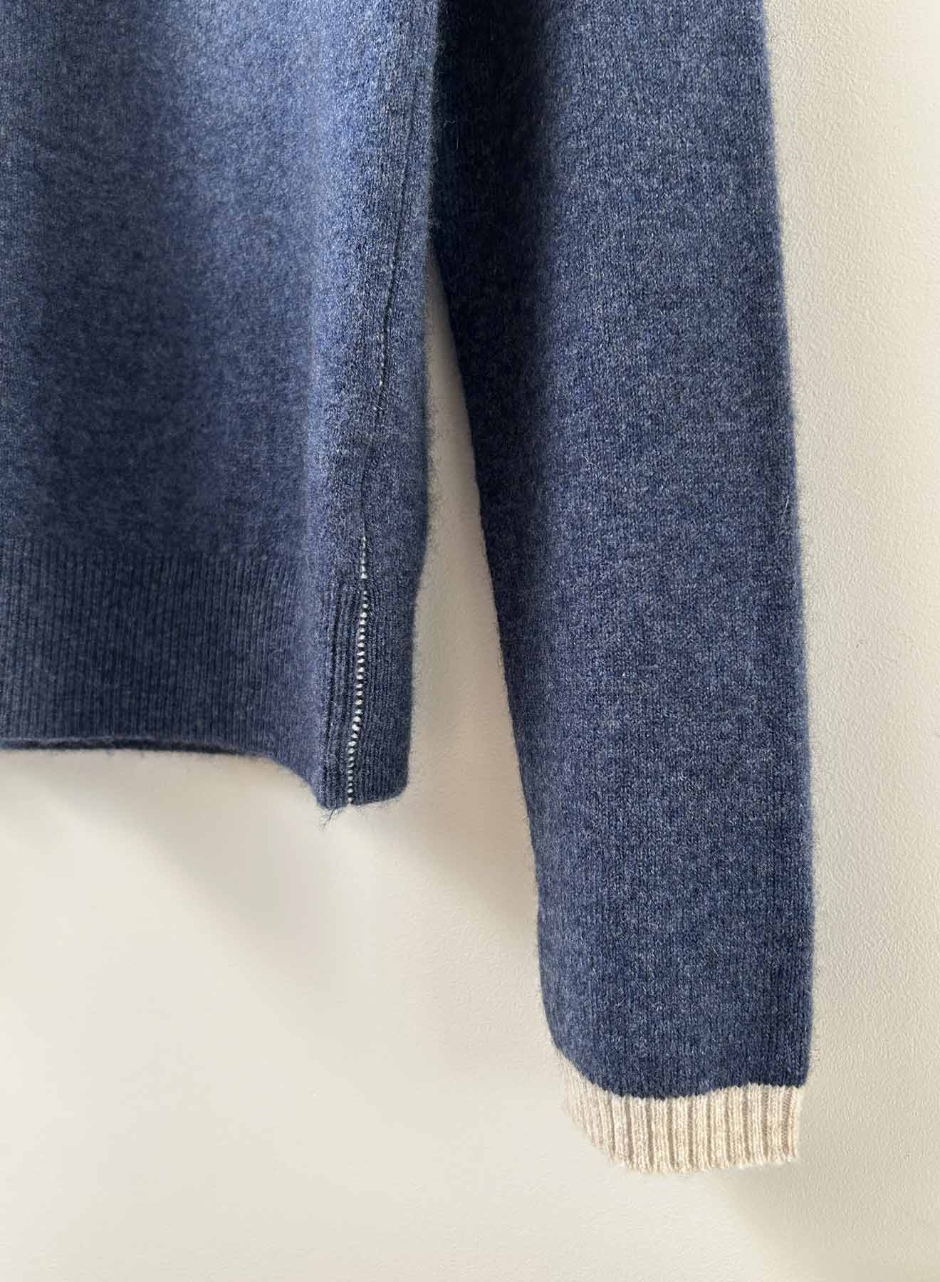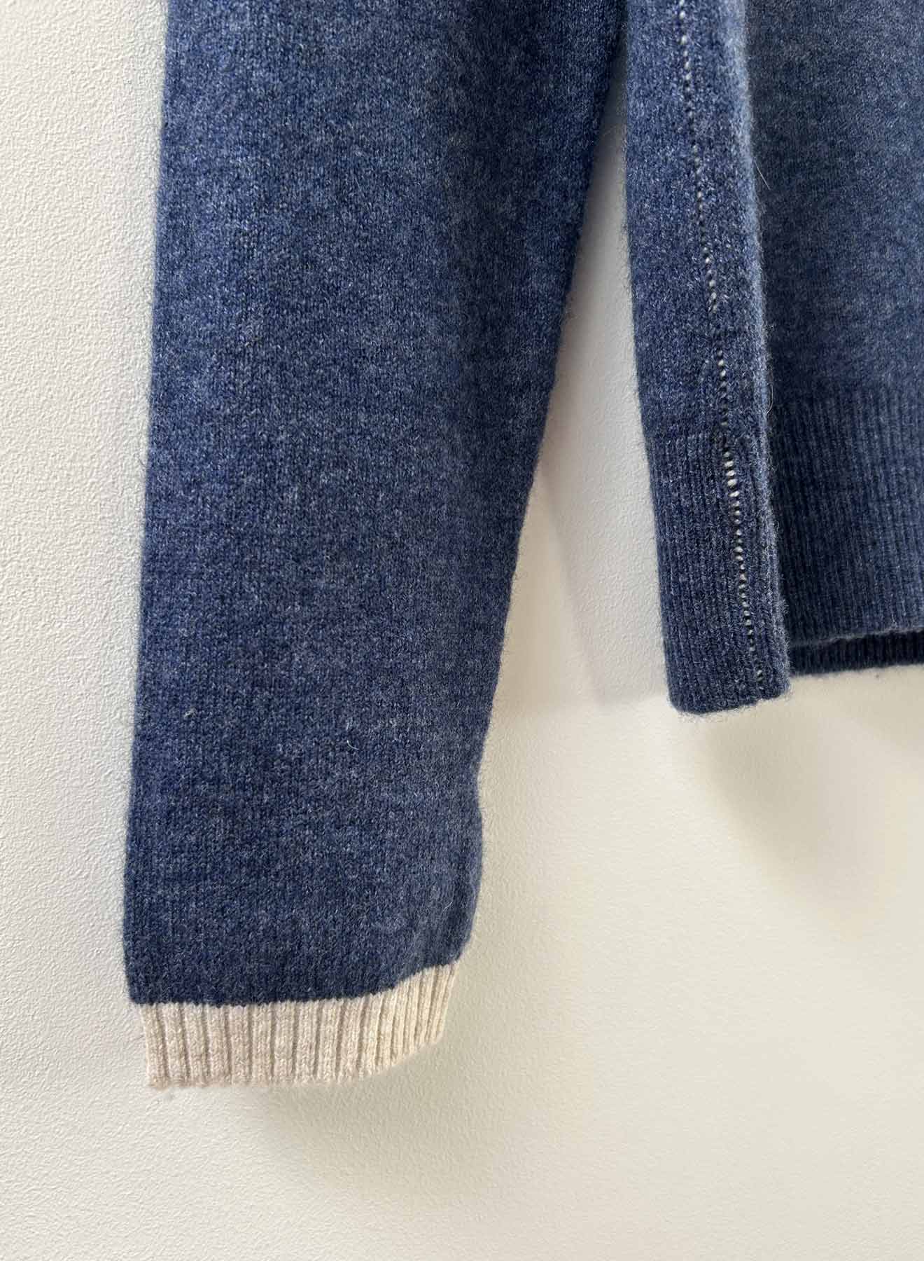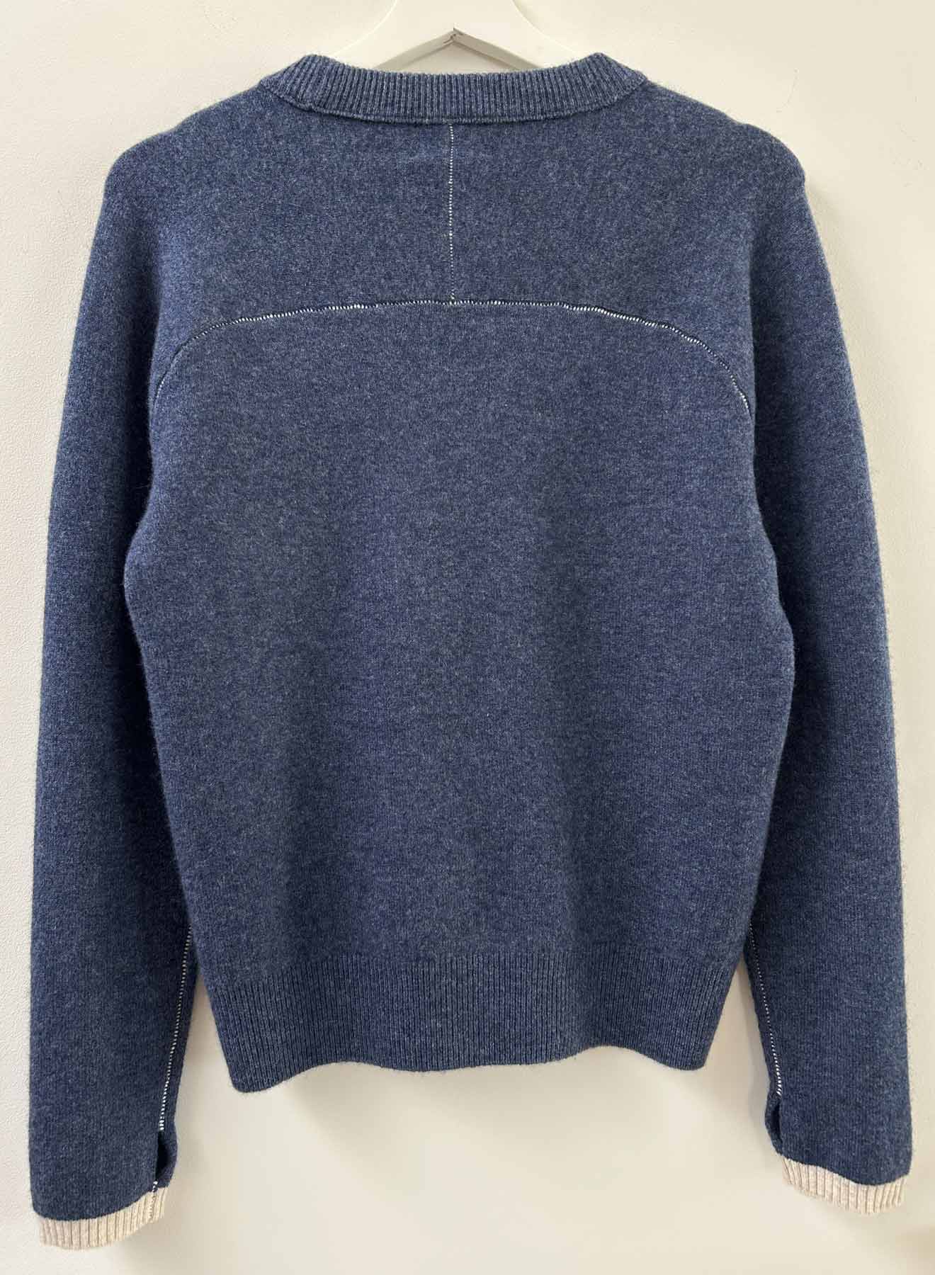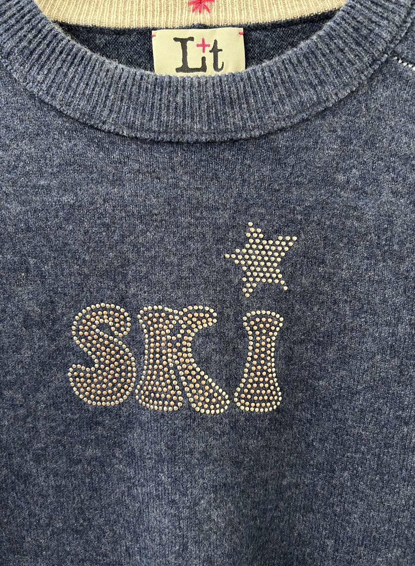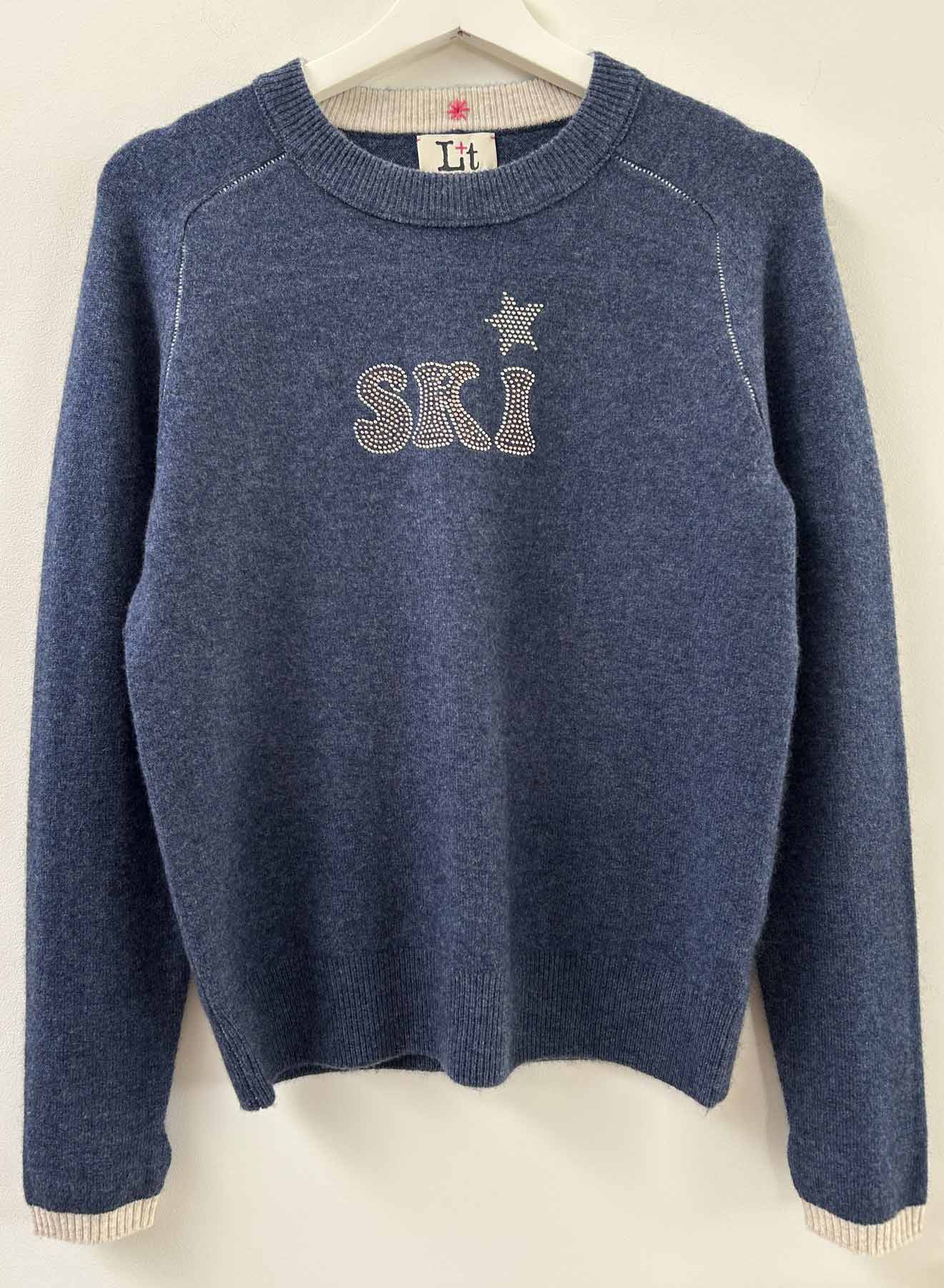 Meet Chrissy Ski Crew, a must-have this season. We developed a unique way to knit and finish our cashmere/wool blend making it extra lofty, soft, and stretchy. Seams are linked with playful contrast yarn, purposefully glimpsing at every seam for a fun vintage nod. Embellished with metallic studs and crystals, slim fitting with a saddle shoulder and a seamed yoke. Close-fitting crew neck with contrast interior pop color and sleeve cuffs. Extra long sleeves are finished with a thumbhole. Use the thumbhole on colder days and let the cuff warm the top of your hands as it peeks out under your jacket. Or simply push up the sleeves for soft accordion ease when back inside.