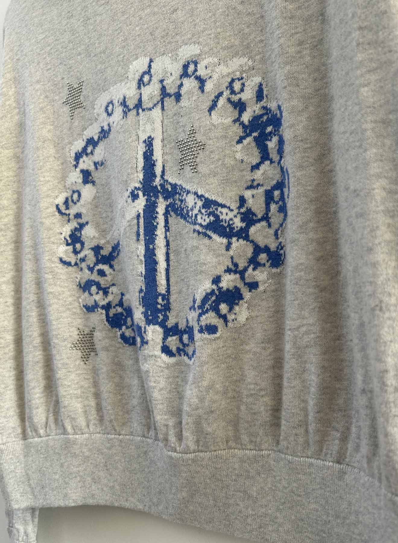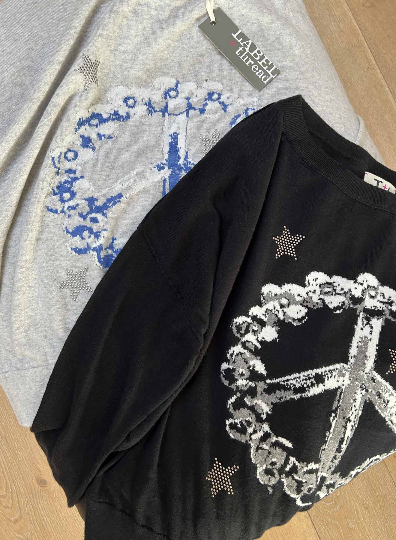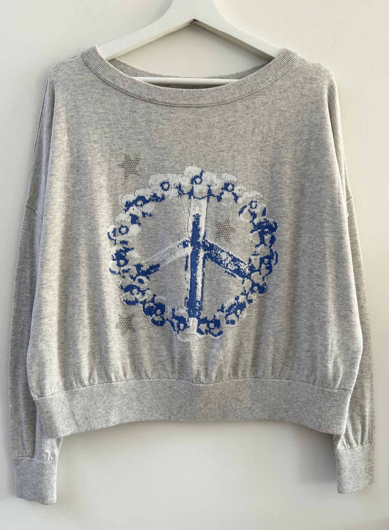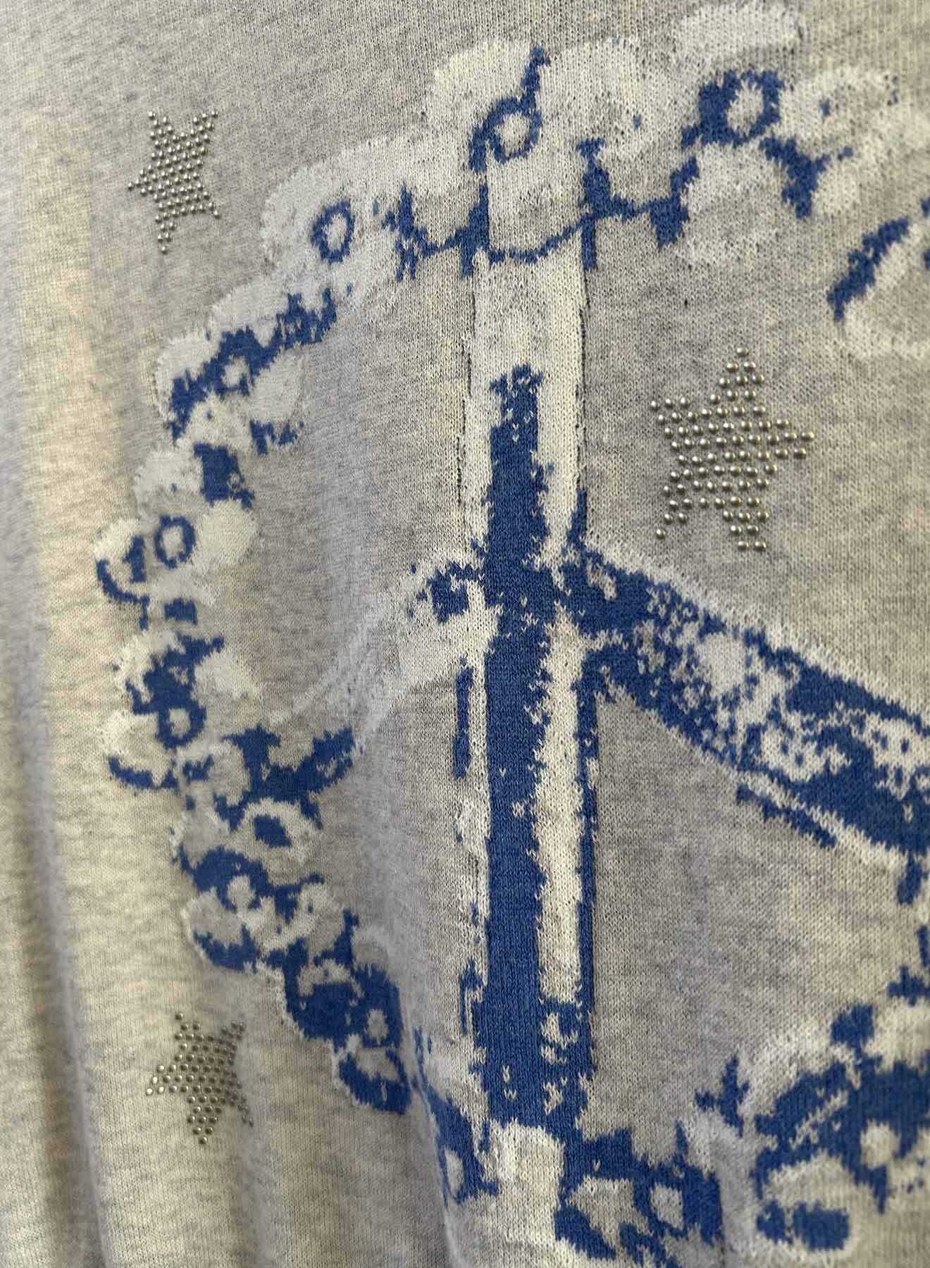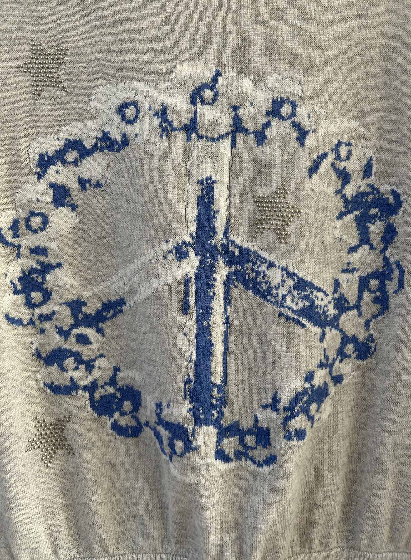 The Rose Peace Stud sweater puts a dreamy, boho spin on a classic knit. Designed with a peace-shaped flower wreath in true intarsia knitting, this standout graphic feels both playful and artisanal. Crafted from our cotton cashmere transition blend, it's soft, cozy, and made for everyday wear. The cropped, hug-fit silhouette with fitted cuffs and hem pairs perfectly with high-waisted denim or casual shorts, while star studs add a whimsical finishing touch.