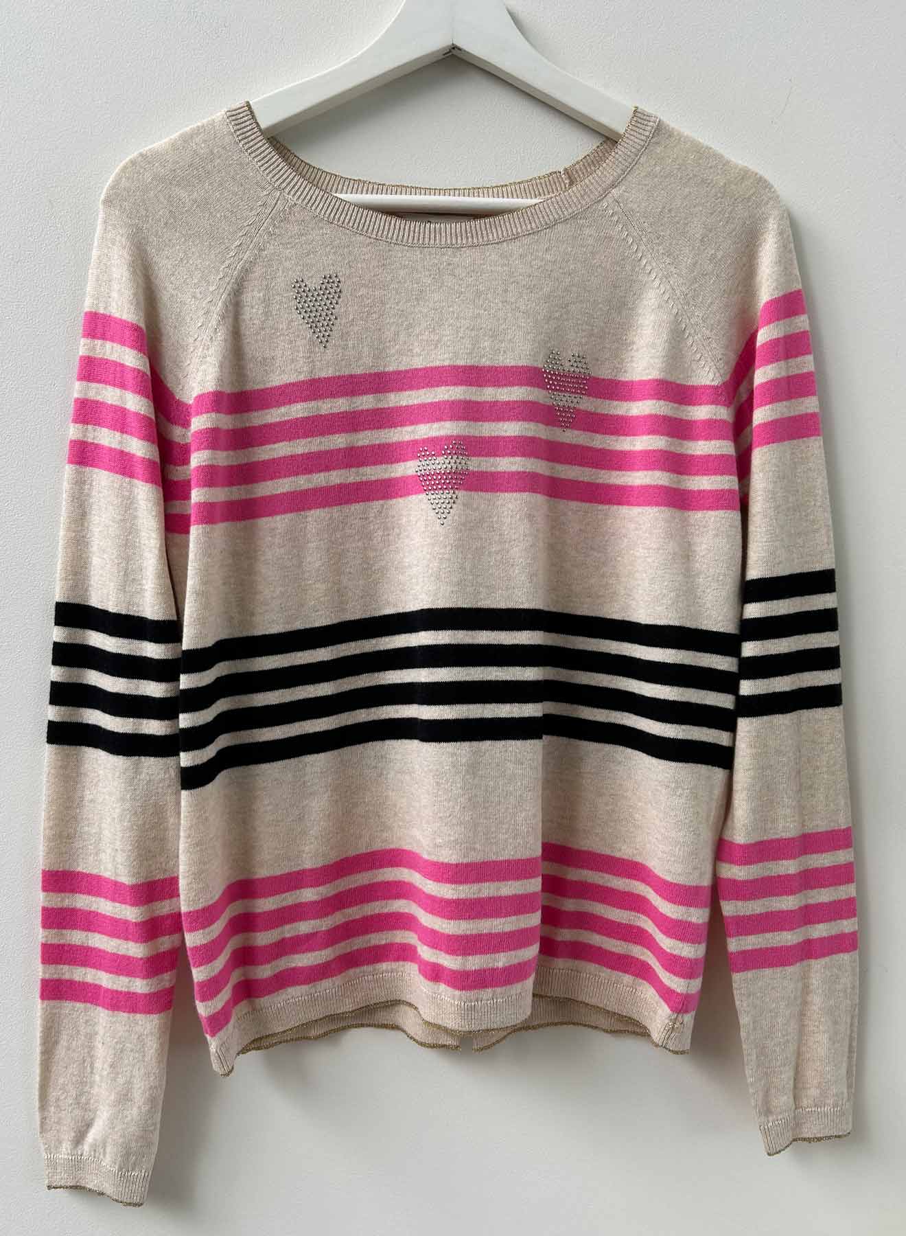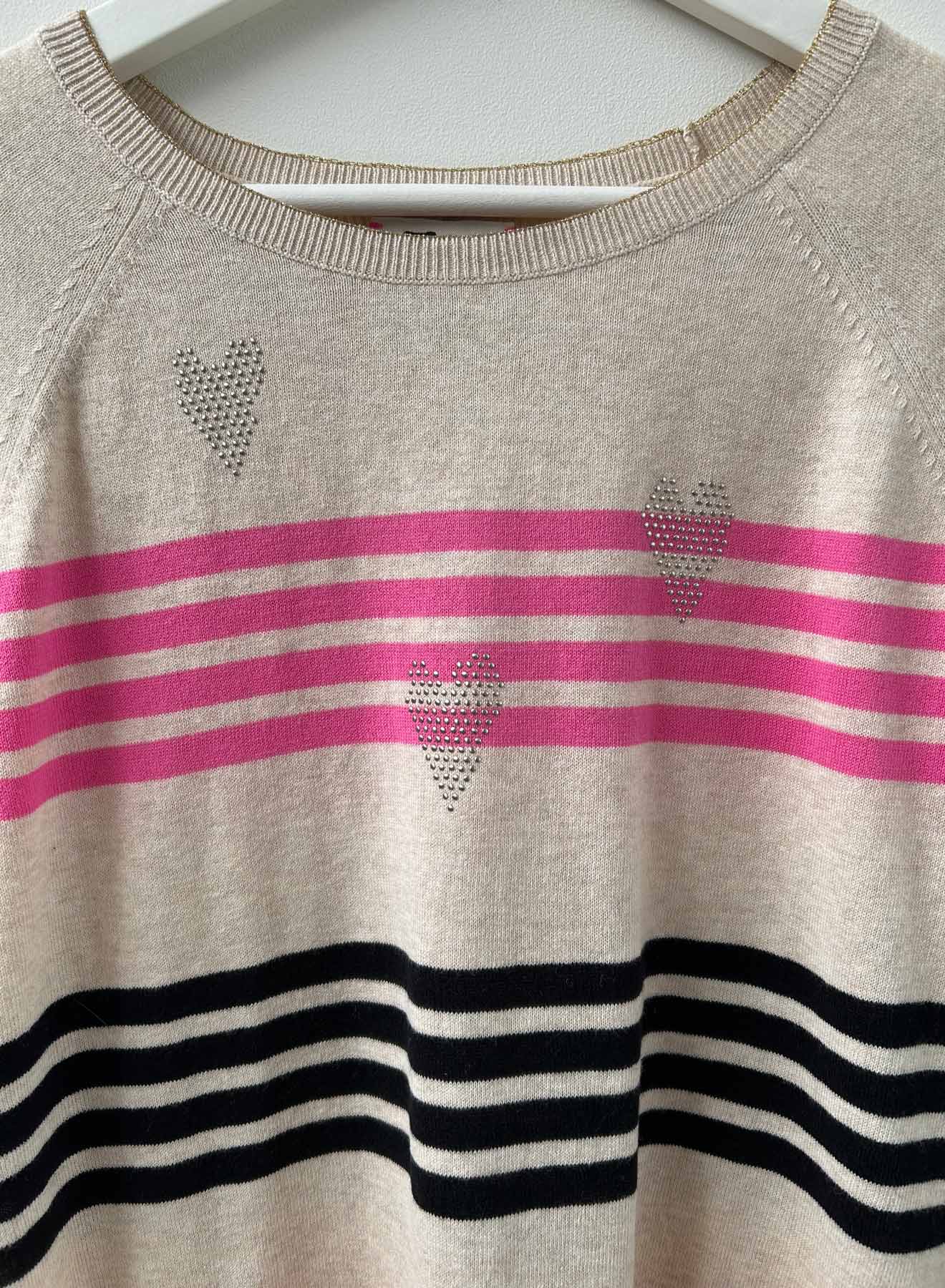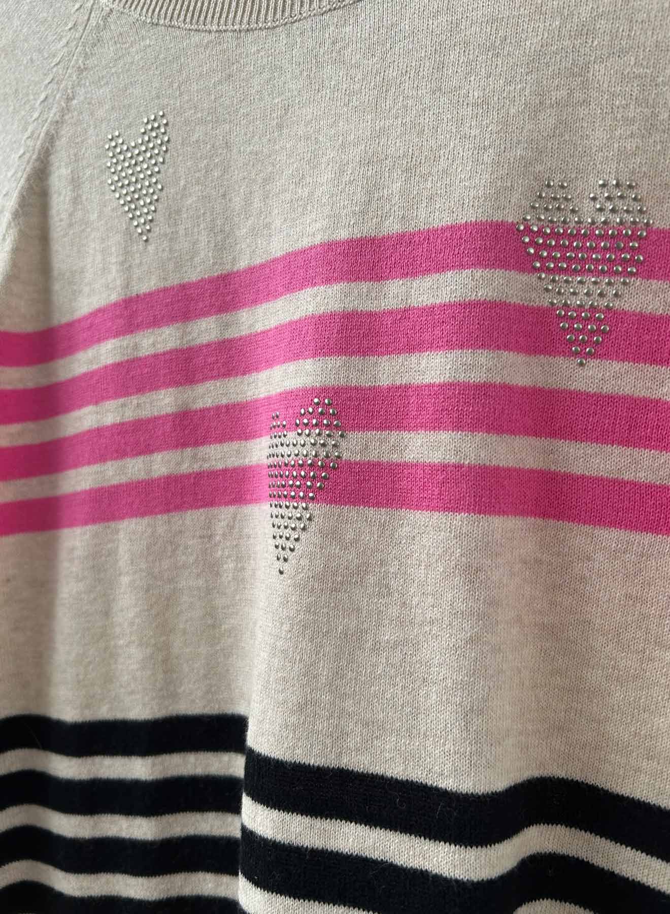 The Violet Stripe Crew will make your day! Made from 100% cotton, light weight and cheerful stripes, with heart studs across the front. Lurex tipping at neck, glittering hand stitches in metallic and pop color pink - what's not to celebrate about this all season top? Wear now or hold for later into spring/summer.