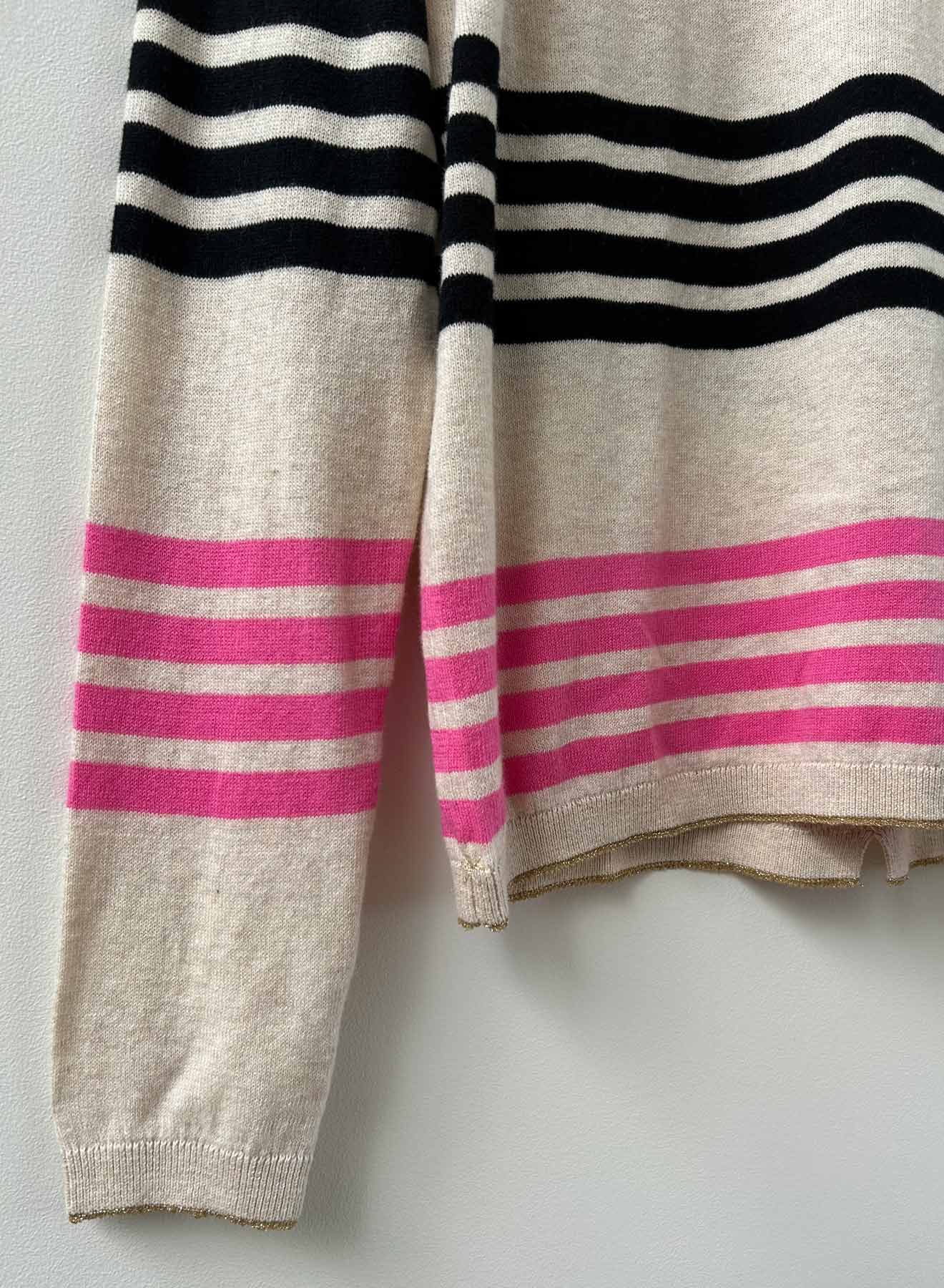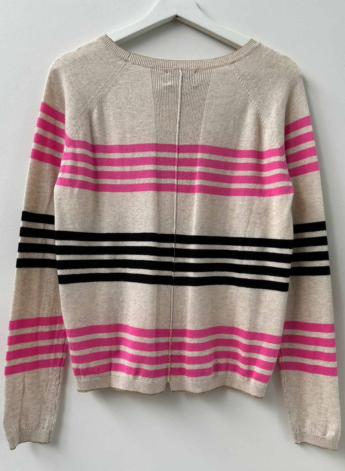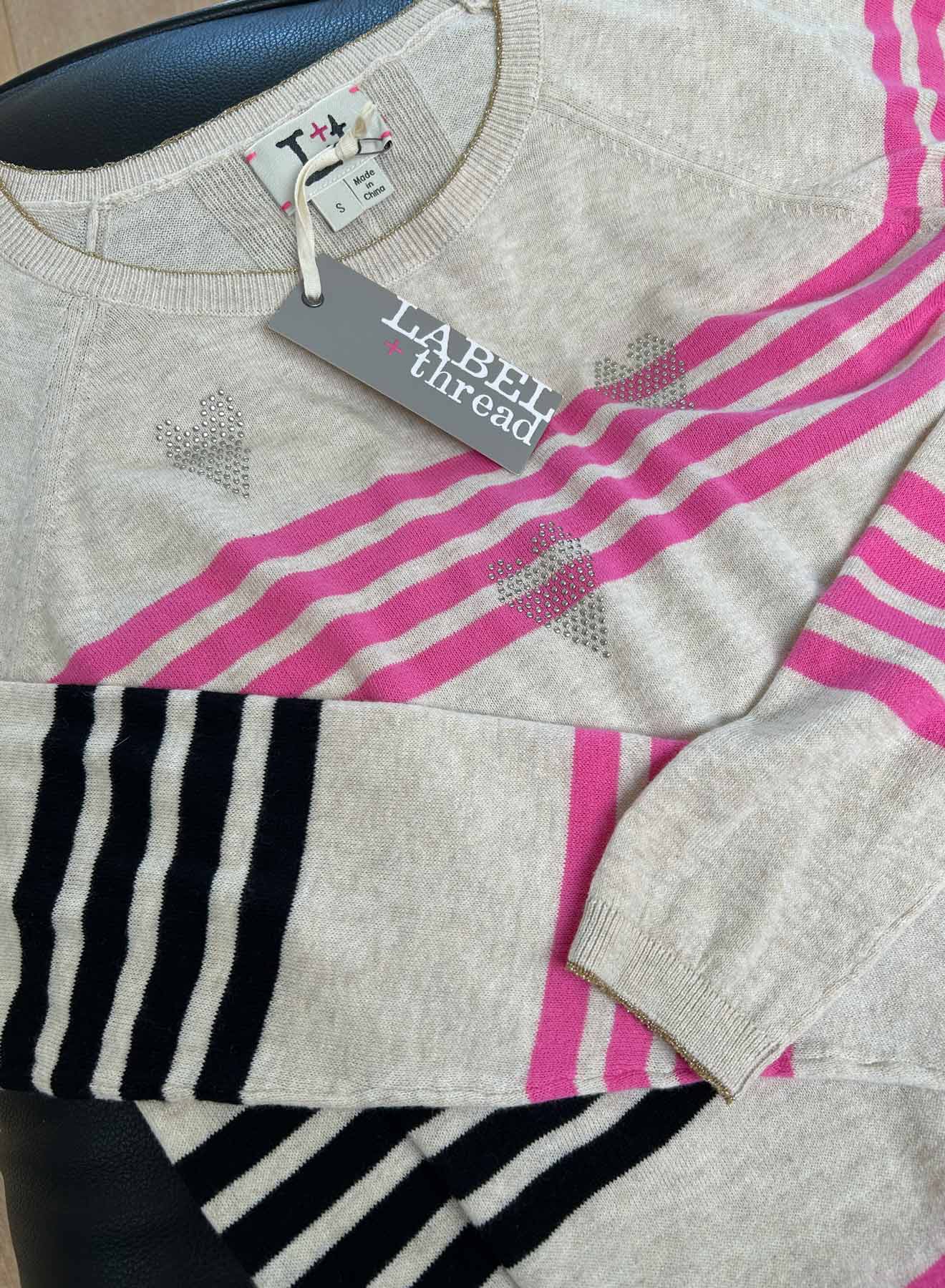 The Violet Stripe Crew will make your day! Made from 100% cotton, light weight and cheerful stripes, with heart studs across the front. Lurex tipping at neck, glittering hand stitches in metallic and pop color pink - what's not to celebrate about this all season top? Wear now or hold for later into spring/summer.